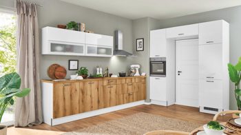 L-Küche mit Einbauspüle und Mischbatterie, Elektrogeräten und Stauraum