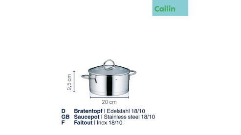 In ausgezeichneter Qualität: der Bratentopf Cailin aus 18/10 Edelstahl in Glanzoptik, mit Kapselboden und 0,8 mm Wandstärke. Inklusive Glasdeckel mit Edelstahlgriff. Geeignet für Gas, Glas-Keramik, E-Herd und Induktionsherd. Backofenfest bis 180° C. Maße ca. 20 x 10 cm (DxH), Volumen 2,45 l. Spülmaschinenfest. Lieferung im Geschenkkarton.