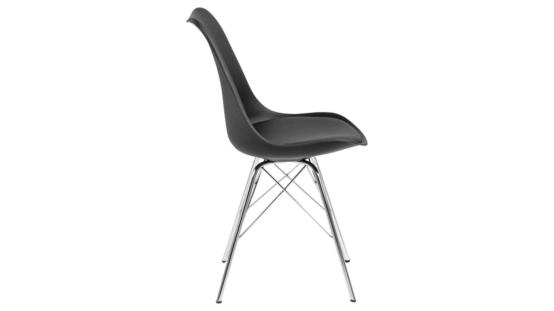 Dieser Polsterstuhl verkörpert puristische Eleganz. Als stabile, dabei aber wunderbar filigran designte Basis fungiert ein verchromtes Stahldrahtgestell. Darauf befindet sich eine schwarze Sitzschale aus robustem Kunststoff. Sie ist rundherum mit schwarzem Kunstleder bezogen, das sowohl qualitativ als auch optisch und haptisch überzeugt. Die Farbgebung sorgt für eine klassisch-schlichte Ausstrahlung.