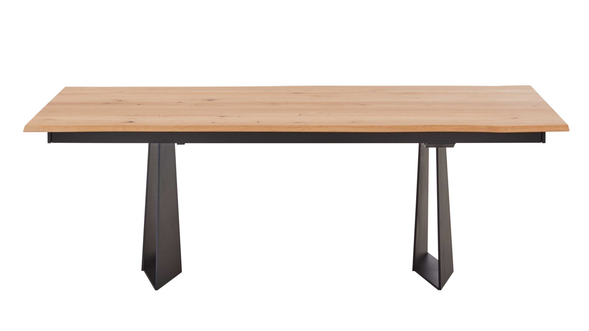 Als Highlight des Esszimmertisches fungiert die Echtholzplatte mit Baumkante. Sie besteht aus soft gebürsteter und geölter heller Wildeiche und ist ca. 25 mm stark. Für die nötige Standstabilität sorgt das robuste matt anthrazitfarbene Metallgestell.