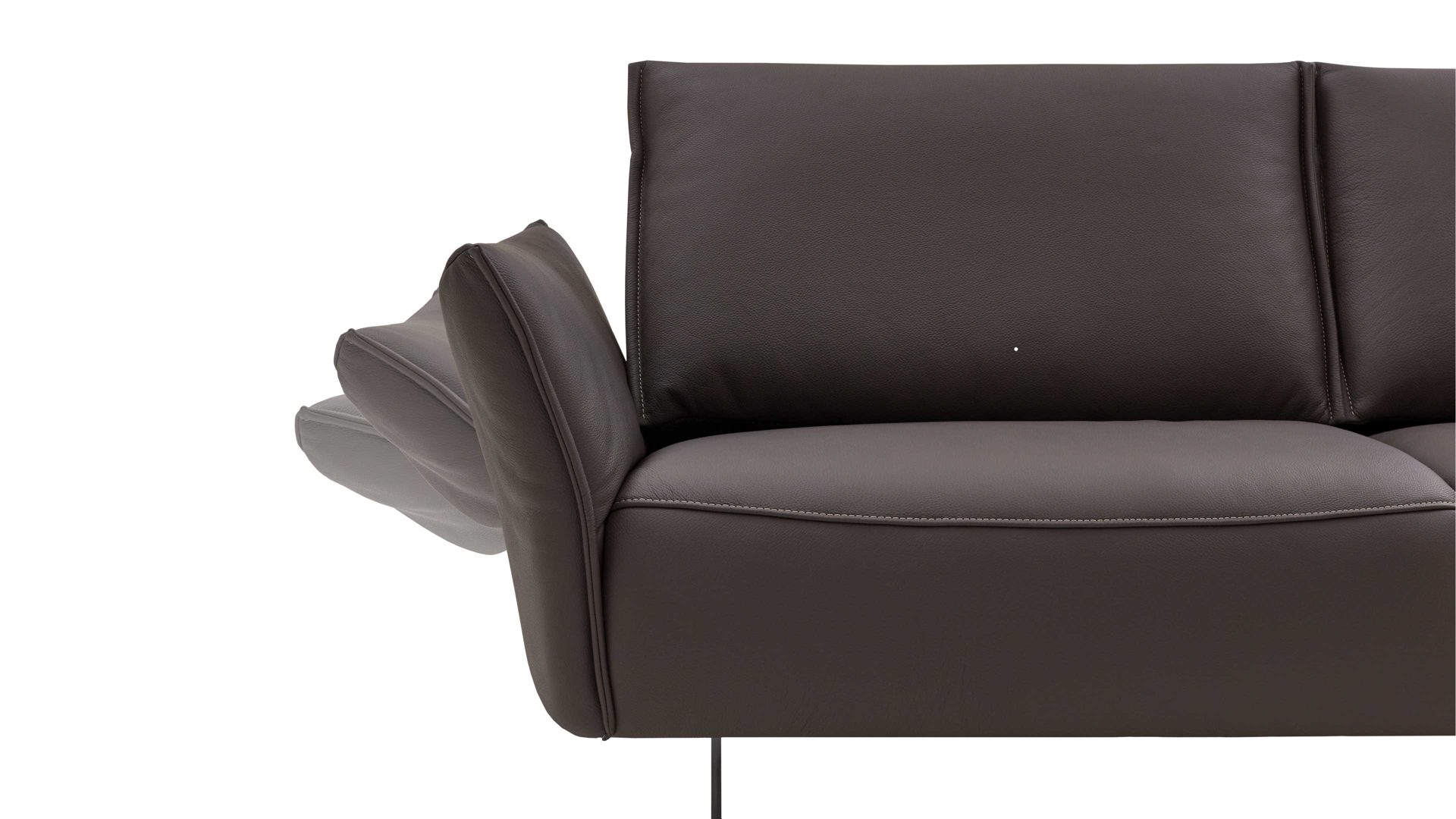 Das Funktionsarmteil der Couch ist durch einen Rasterbeschlag in verschiedenen Positionen verstellbar und bietet somit die Möglichkeit, die Armlehnen individuell an die Bedürfnisse anzupassen. Durch einfaches Ziehen über die höchste Position hinaus kann das Armteil wieder zurück in die Grundposition gebracht werden. Die Breite bei abgeklappter Armlehne vergrößert sich dann um bis zu 12 cm.