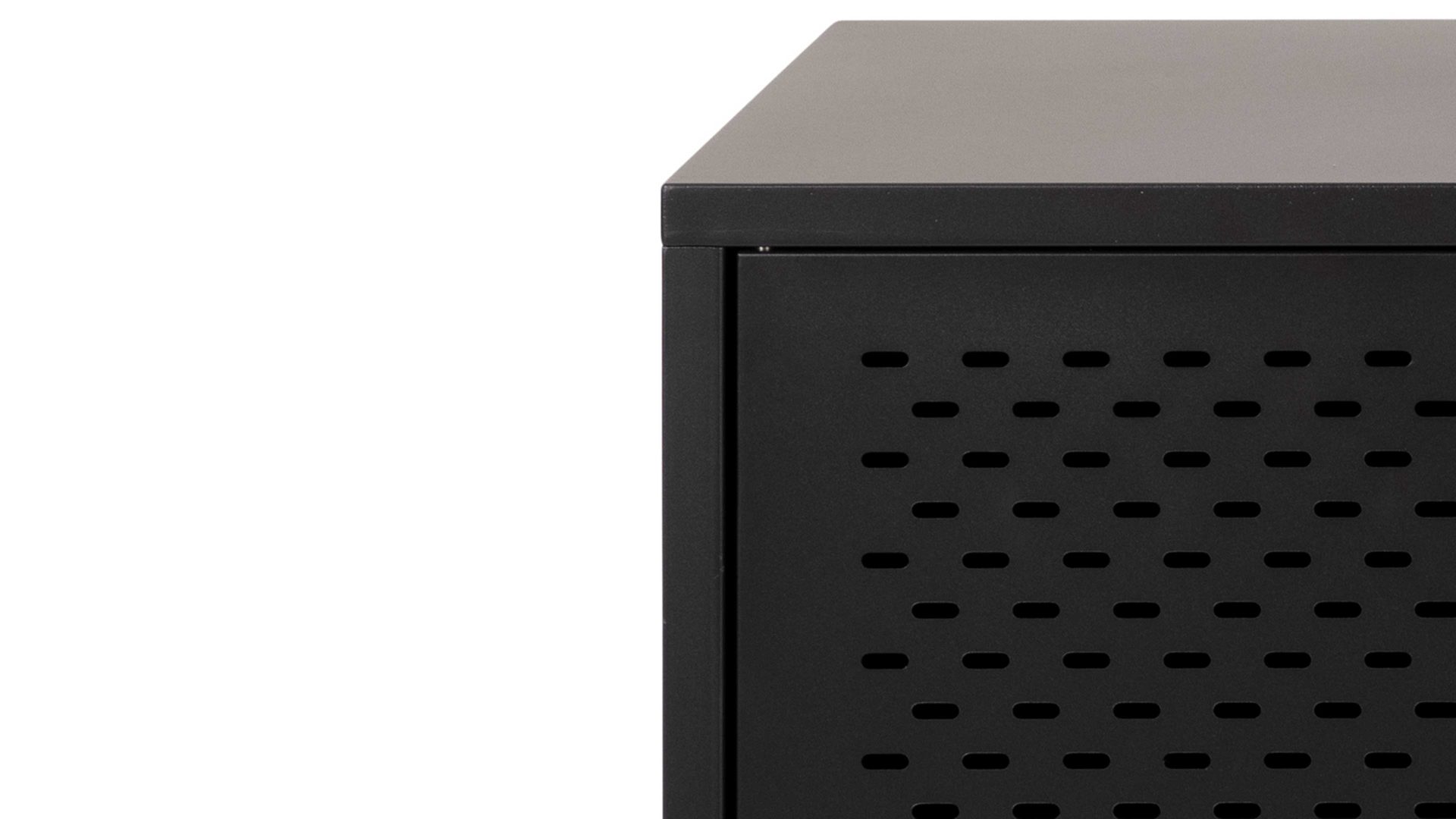 Dieses Sideboard ist im modern interpretierten Industriestil designt. Damit verströmt es spezielles Flair und zieht die Blicke auf sich. Die außergewöhnlich gestaltete Kommode besteht aus mattschwarz pulverbeschichtetem Metall mit rauer Oberfläche. Durch das erstklassige Material und die hochwertige Verarbeitung ist sie enorm robust und langlebig.