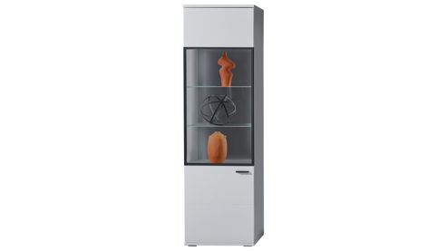 eintürige Highboard-Vitrine, nach rechts zu öffnen - mit zwei Schubladen, einem offenen Fach und einem Holzboden