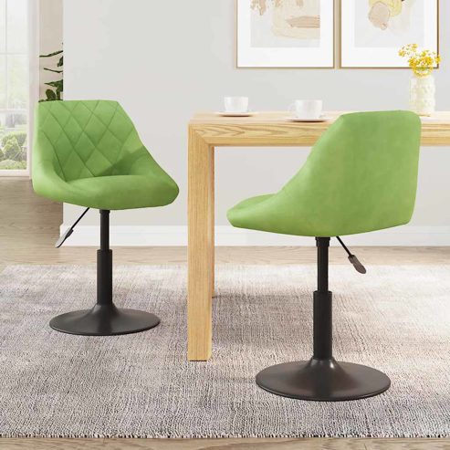 Diese trendigen drehbaren Esszimmerstühle mit modernem Design sind eine tolle Bereicherung für Ihren Wohnraum. Diese Drehstühle sind mit weichem Samt bezogen und bieten daher optimalen Sitzkomfort. Der schwarz pulverbeschichtete Stahlrahmen sorgt für hohe Stabilität. Dank der Gasdruckfeder können diese Esszimmerstühle in der Höhe verstellt werden, was sie zu einer perfekten Ergänzung zu Ihrem Essbereich macht. Zudem lassen sie sich flexibel um 360 Grad drehen. ** Farbe: Hellgrün ** Material: Samt (100% Polyester), Stahl ** Abmessungen: 46 x 44 x (62,5-77,5) cm (B x T x H) ** Sitztiefe: 38,5 cm ** Rückenlehnenhöhe: 30,5 cm ** Durchmesser des Standfußes: 38,5 cm ** Um 360 Grad drehbar ** Mit Gasdruckfeder ** Höhenverstellbar: Ja ** Zusammenbau erforderlich: Ja ** Lieferung enthält: ** 2 x Drehbarer Esszimmerstuhl