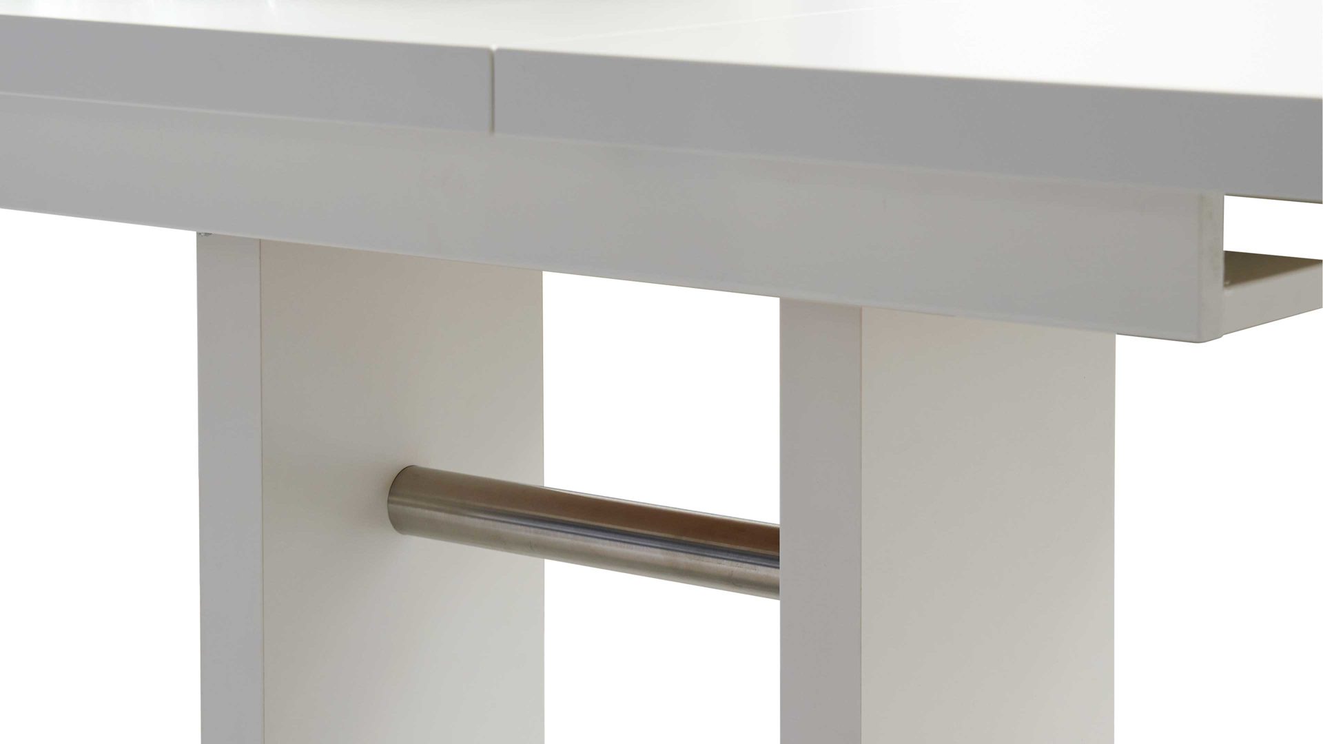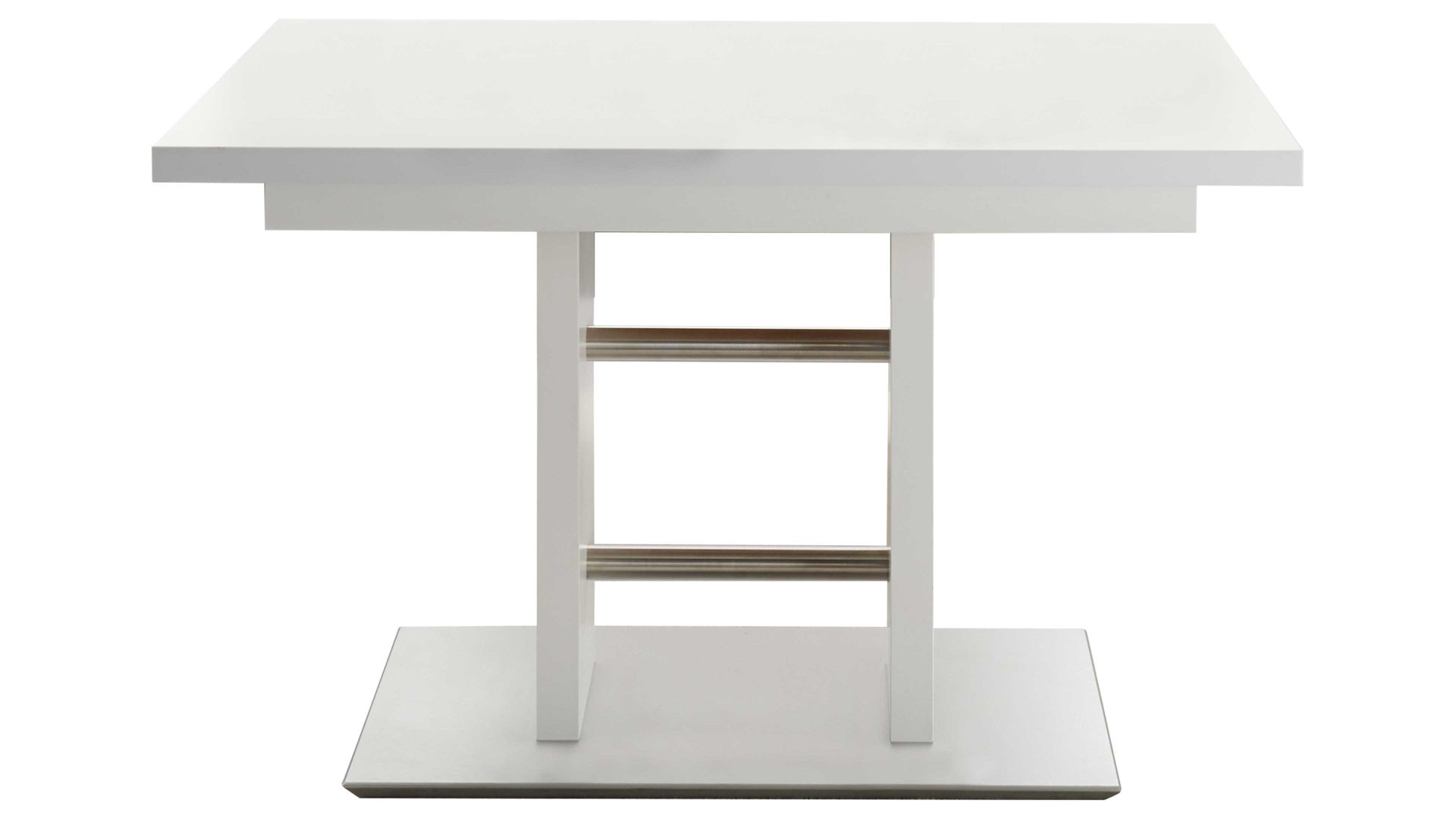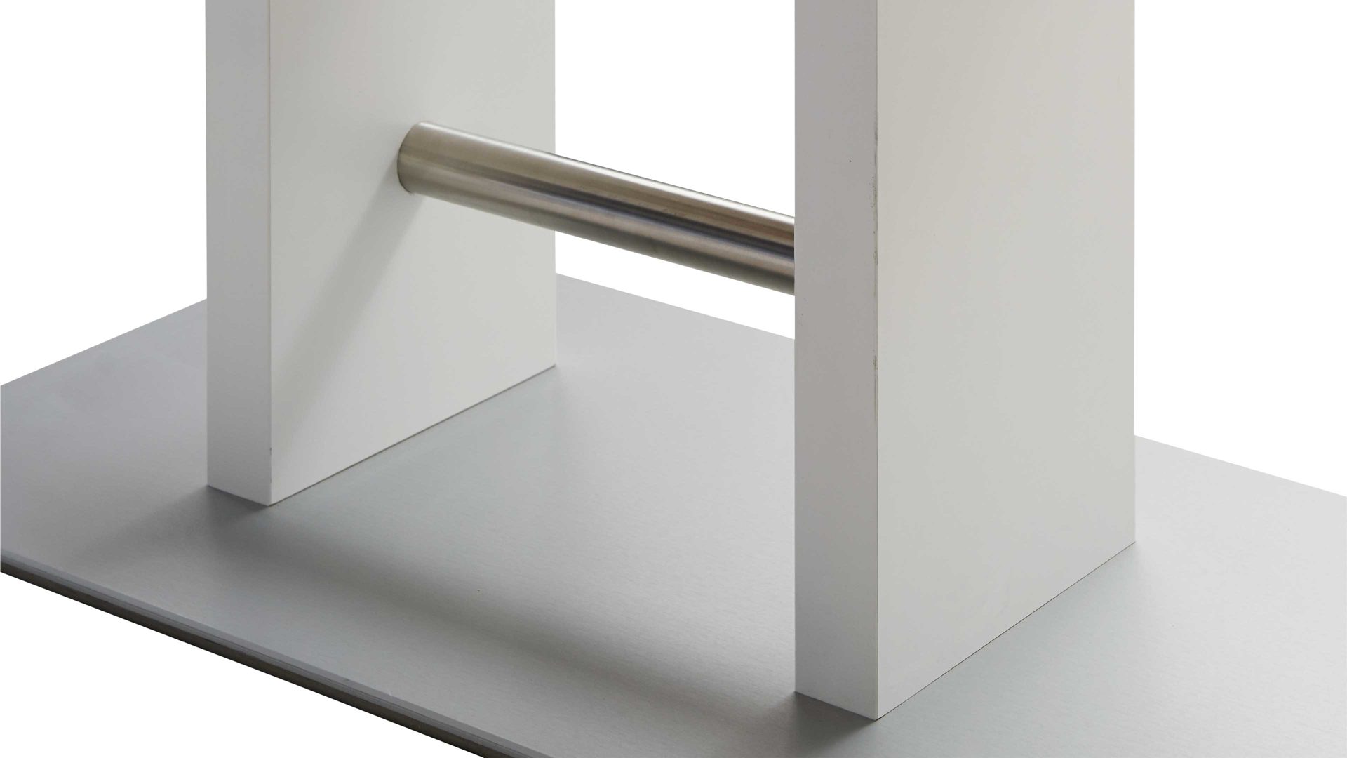 Als stabilisierende Basis fungiert eine klassisch-edelstahlfarbene Bodenplatte. Auch die Querstreben des Gestells sind im Edelstahlton gehalten. Durch die strahlend weißen Kunststoffoberflächen, die sowohl das Gestell als auch die Tischplatte zieren, erscheint der Esszimmertisch besonders leuchtend und einladend.