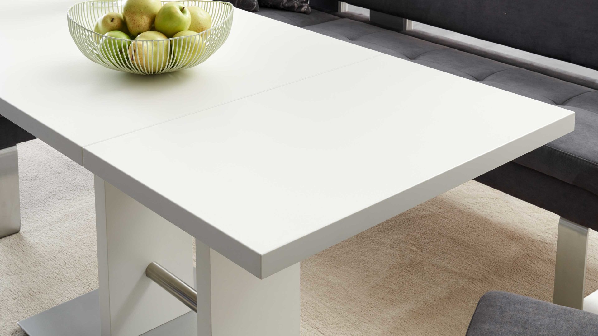 Den Funktionshöhepunkt bildet die ca. 48 cm breite Ansteckplatte, mit der Sie den Tisch bei Bedarf im Handumdrehen verlängern können. Dies ist etwa dann äußerst praktisch, wenn Sie mehrere Gäste zum Essen empfangen.