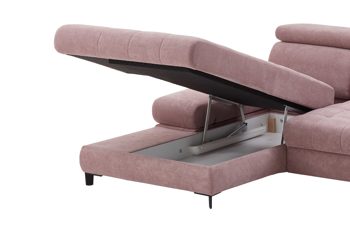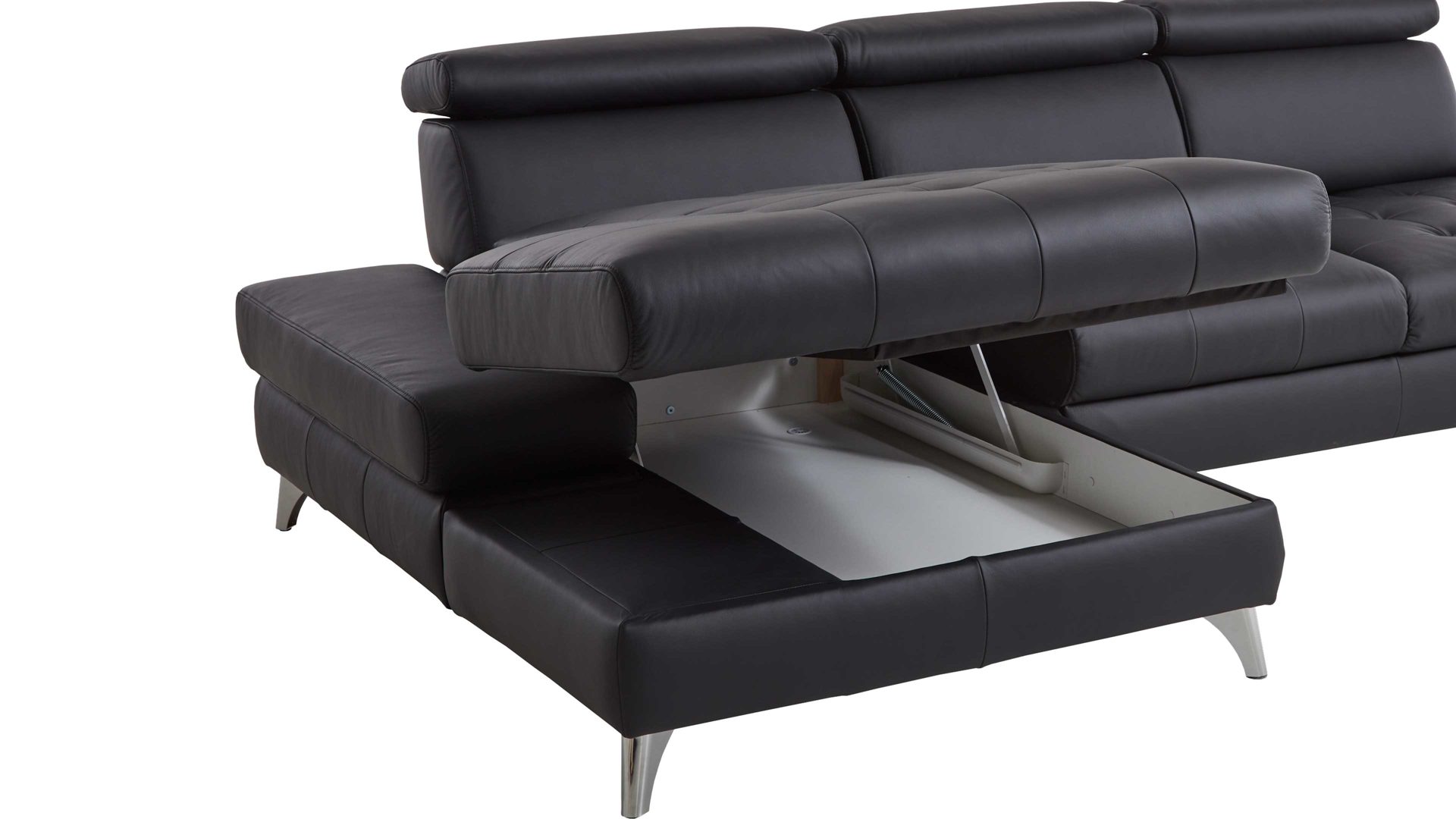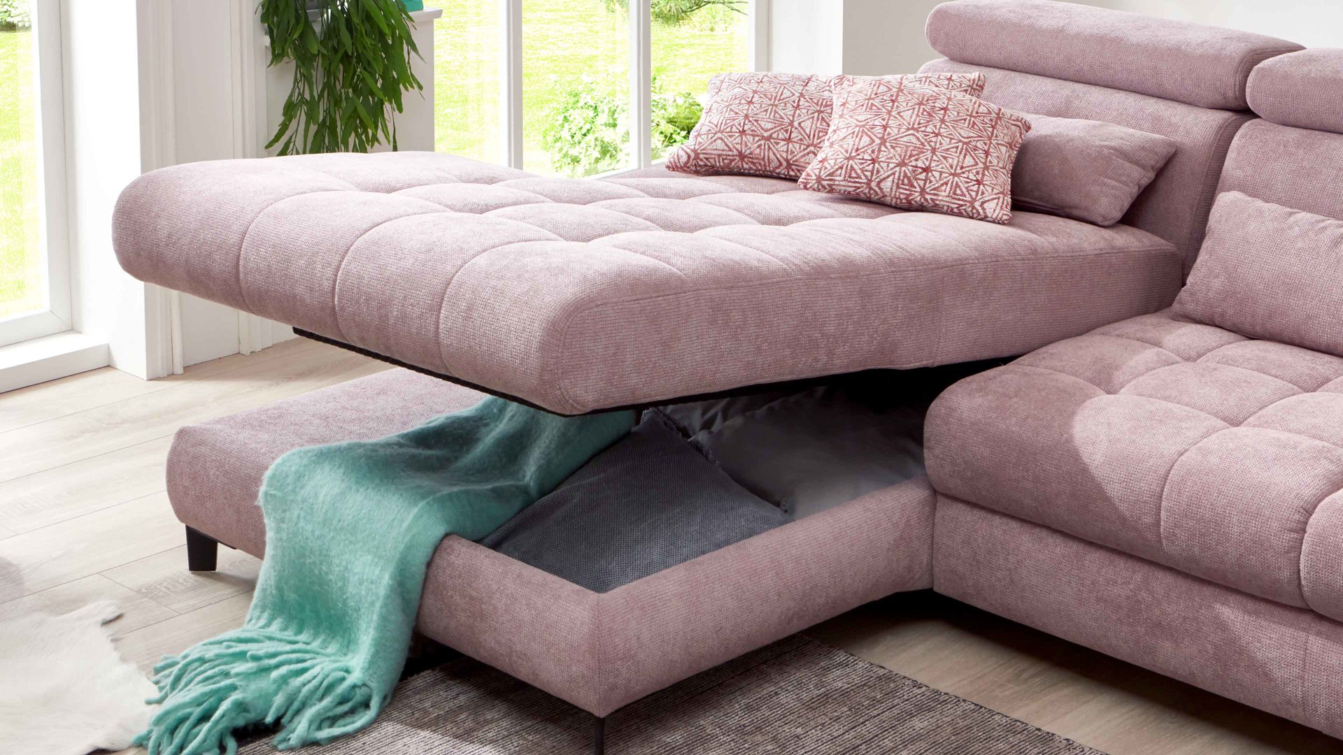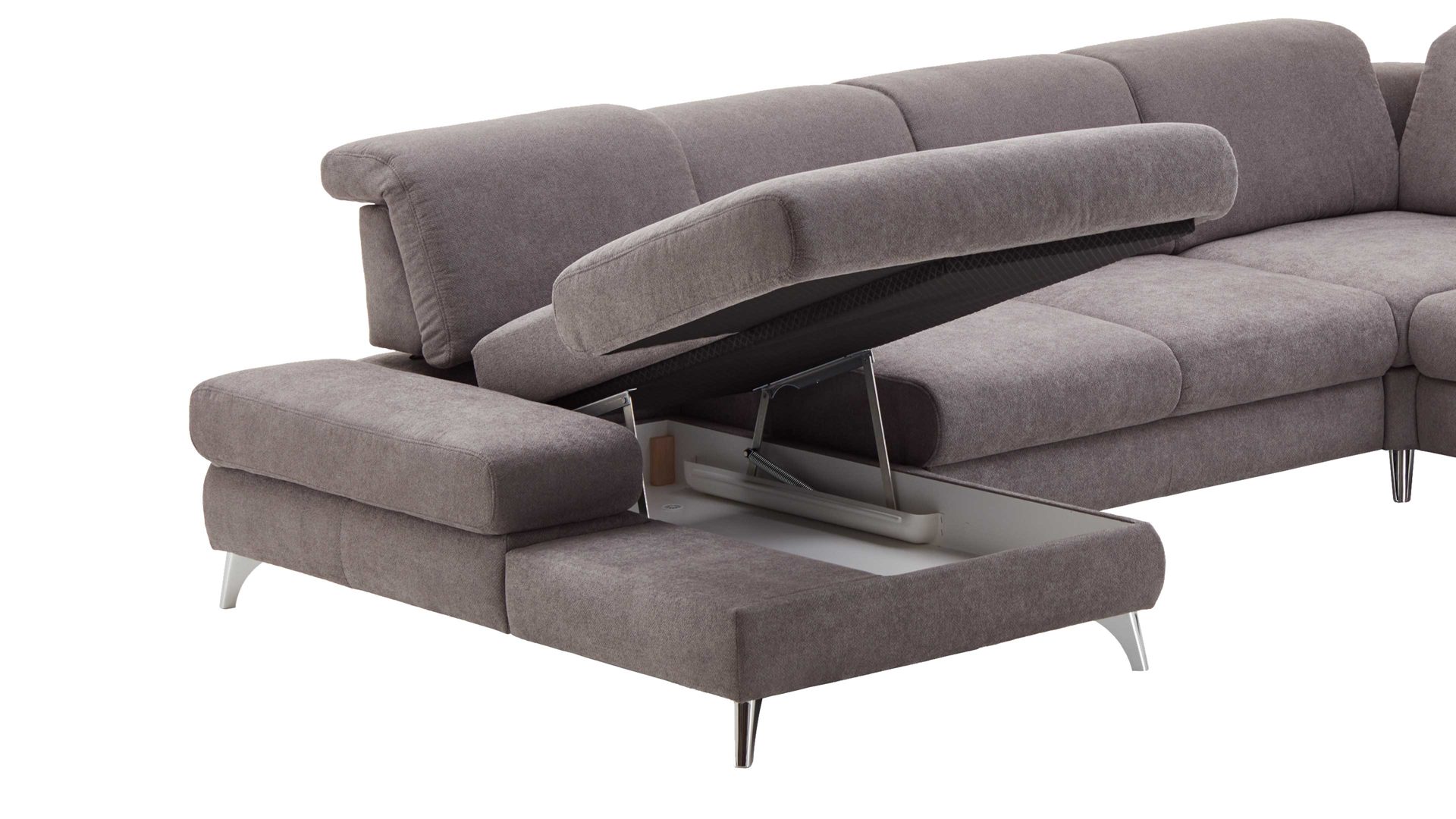 Mit der praktischen Möglichkeit, die Sitzfläche im Handumdrehen hochzuklappen und den Raum darunter zur Aufbewahrung verschiedener Gegenstände (Kuscheldecken, Zierkissenbezüge et cetera) zu nutzen, verwandelt sich der jeweilige Longchair in ein multifunktionales Möbel - flexibel einsetzbar und gemütlich. Der Mehrpreis wird pro Element berechnet.