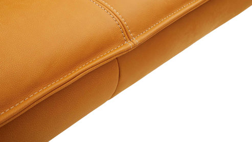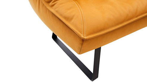 sonnengelber Lederbezug mit einer beigen Kontrastnaht und mattschwarzen Metallkufen