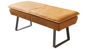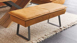 sonnengelber Lederbezug mit einer beigen Kontrastnaht und mattschwarzen Metallkufen
