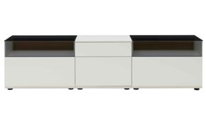 Im Zentrum der Wohnlösung steht das dreiteilige Lowboard, das ideal für dein TV-Setup geeignet ist und mit ca. 180 x 54 x 45 cm (B/LxHxT) die perfekte Medienbasis bildet. Links und rechts befindet sich je ein Element mit Auszug, Glasfront und Glasoberboden, dazwischen ergänzt ein mittleres Element mit Tür und höhenverstellbarem Holzboden den funktionalen Stauraum. So lässt sich Technik dezent integrieren, während Oberflächen und Glasflächen elegante Akzente setzen.