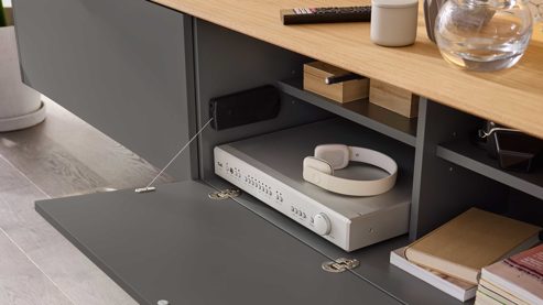 Interliving Wohnzimmer Serie 2035 – TV-Wand in dunkelgrauem Mattlack und hellem Eichefurnier