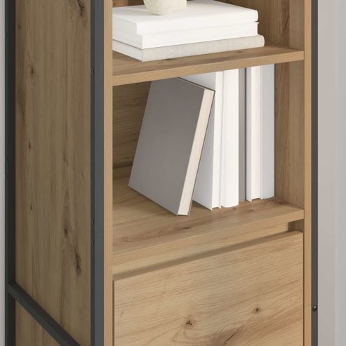 Dieses industrielle Bücherregal verbindet modernen Style mit nützlicher Funktion und ist eine praktische Lösung für dein Wohnzimmer. Aus Holzwerkstoff fertiggestellt, hat es eine schicke rechteckige Form, die sich super in verschiedene Räume einfügt. Die robuste Bauweise mit Stahlbeinen macht das Regal zu einer zuverlässigen Wahl für jeden Haushalt. Es ist vielseitig einsetzbar, perfekt zum Aufbewahren von Büchern, Ausstellen von Deko oder für andere wichtige Dinge, und verleiht deinem Raum einen rustikalen Charme. Holzwerkstoff-Konstruktion: Das Regal besteht aus hochwertigem Holzwerkstoff, der stabil und langlebig ist. Dadurch bleibt es viele Jahre ein echter Hingucker in deinem Zuhause. Stahlbeine für Stabilität: Die robusten Stahlbeine sorgen für Stabilität und sicheren Halt. Diese Materialkombination garantiert eine solide Basis und Langlebigkeit, auch bei schweren Gegenständen auf den Regalen. Geräumige Stauraumkapazität: Das Regal bietet viel Platz für alles Mögliche, von Büchern bis zu Deko. Die vielen Fächer helfen, Ordnung zu halten und deinen Wohnraum sauber zu halten. Visuelle Anziehung und Design: Sein modernes, industrielles Design macht das Regal zu einem tollen Blickfang. Die Kombination aus Holz und Stahl zieht alle Blicke auf sich und passt super zu verschiedenen Einrichtungsstilen. Einfache Montage: Die Montage ist einfach und erfordert zwei Personen und einen Schraubendreher, damit du das Regal schnell nutzen kannst und schnell von den praktischen Vorteilen profitierst. ** Farbe: Kunsthandwerk Eiche ** Material: Holzwerkstoff ** Gesamtabmessungen: 43 x 36 x 150,5 cm (L x B x H) ** Mit Schublade ** mit 1 Tür ** Montage erforderlich: Ja ** Lieferumfang: ** 1 x Bücherregal