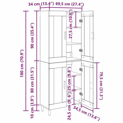 vidaXL Highboard Artisan-Eiche 69,5 x 34 x 180 cm Holzwerkstoff