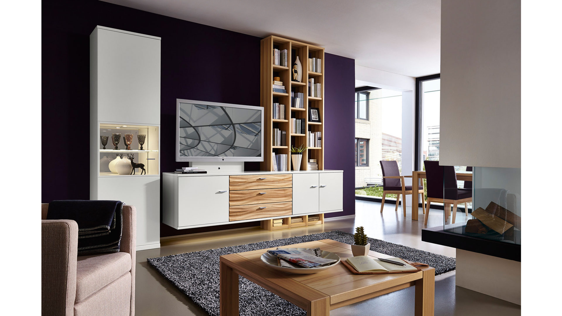 Die Abbildung zeigt ein Wohnbeispiel, welches auch Dekoration sowie separat erhältliches Zubehör enthält. Im Lieferumfang enthalten ist eine Wohnkombination.