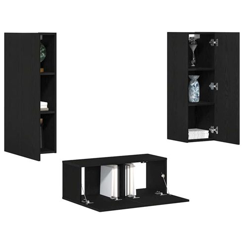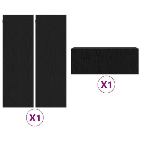 Dieses TV-Schranksatz verleiht deinem Raum eine moderne und minimalistische Ausstrahlung. Mit vier schicken Teilen in einem auffälligen Finish in Schwarz Eiche schafft er nicht nur zusätzlichen Stauraum, sondern dient auch als stilvolles Zentrum. Ideal für Buffets bei Partys oder für die Präsentation deiner Lieblingsdekorationen passt es perfekt in verschiedene Anwendungen. Zeitgemäßer Stil: Das matte Finish und die glatte Texture verbessern das Aussehen der Schränke und ermöglichen es ihnen, sich gut in verschiedene Dekorstile einzufügen, während sie eine klassische Ausstrahlung bewahren. Qualitätsarbeit: Hergestellt aus Holzwerkstoff garantiert dieses Set Langlebigkeit und Robustheit und hält täglichem Verschleiß stand, ohne dabei an Anziehungskraft zu verlieren. Funktionale Aufbewahrung: Mit drei Regalen kannst du ganz einfach deine Mediengeräte, Bücher oder Dekorationen sortieren und deinen Wohnraum ordentlich und aufgeräumt halten. Individuelle Montageoptionen: Das wandmontierte Design gibt dir Flexibilität bei der Platzierung, schafft ein schlankes und offenes Layout und maximiert den Fußbodenplatz in kleineren Bereichen. Einfache Montage: Alles, was du zur Einrichtung deines neuen Entertainment Centers benötigst, ist enthalten, damit du es schnell bereitstellen kannst und du bequem deine Deko-Updates umsetzen kannst. ** Anzahl der Teile: 2 ** Farbe: Schwarz ** Form: Rechteckig ** Material: Holzwerkstoff ** Oberfläche: Matt ** Innen/Außen: Nur innen ** Abdeckung enthalten: Nein ** Zimmer: Wohnzimmer ** Montage enthalten: Wand-/Deckenbefestigungen -z B spezielle Schrauben oder Dübel sind nicht enthalten ** Oberflächenhöhe: 2 cm ** Schwenkbewegung: Nein ** Marke: ** Lieferumfang: Entertainment Center ** Montage erforderlich: Ja ** Empfohlene Anzahl von Personen für die Montage: 2