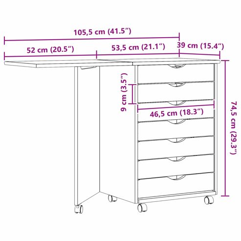 Dieser Rollschrank mit Schreibtisch bringt modernen Stil und Funktionalität zusammen und ist für multifunktionale Bedürfnisse gemacht. Durch das schlichte und praktische Design ist er die perfekte Ergänzung für jeden Wohn- oder Arbeitsraum. Dieses moderne Möbelstück ist ein vielseitiger Begleiter für alle, die effizient organisieren und arbeiten wollen. Die glatte rechteckige Form und das natürliche Kiefernholz verleihen eine frische Atmosphäre, die jeden Raum aufwertet. Moderne Einfachheit: Mit seinem klaren Design strahlt der Rollschrank mit Schreibtisch Funktionalität und Eleganz aus. Die einfachen Linien und das Fehlen von zu viel Schnickschnack machen ihn zu einer praktischen und gleichzeitig ansprechenden Ergänzung in jedem Raum. Das moderne Aussehen passt zu jedem zeitgenössischen Interieur. Robustes Material: Dieser Schrank ist aus massiven Kiefernholz gefertigt und bietet Stabilität und Langlebigkeit. Die Materialwahl sorgt dafür, dass er auch bei häufigem Gebrauch lange hält, was ihn ideal für Büros oder Schlafzimmer macht. Integriertes Design: Dank der klappbaren Tischplatte ist dieser 2-in-1-Rollschrank platzsparend. Ob als Schreibtisch oder Stauraum genutzt, bietet er Funktionalität und Effizienz für alle, die ihren Platz optimal nutzen möchten. Praktische Eigenschaften: Mit seinen angebrachten Rädern lässt sich der Schrank mühelos bewegen. Das macht es einfacher für Leute, die oft die Anordnung ihrer Möbel ändern möchten, und erhöht die Flexibilität des Raumes. Einzigartige Aufbewahrungslösung: Die minimalistischen Kanten-Griffe ermöglichen einen einfachen Zugriff auf die gelagerten Gegenstände. Diese Griffe, die clever platziert sind, sorgen für einfache Handhabung und halten zugleich eine ordentliche Optik. ** Farbe: Klarlack ** Material: Massivholz Kiefer ** Gesamtabmessungen: 105,5 x 39 x 74,5 cm (L x B x H) ** mit 7 Schubladen ** Anzahl Staufächer: 7 ** Montage erforderlich: Ja ** Lieferumfang: ** 1 x Rollwagen mit Schreibtisch