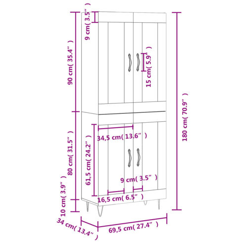 Auf der Suche nach einem stilvollen Highboard? Dieser Schrank verleiht deiner Einrichtung einen eleganten Charme! Langlebiges Material: Holzwerkstoff ist ein Material von außergewöhnlicher Qualität mit glatter Oberfläche, das sich durch Festigkeit, Stabilität und Feuchtigkeitsbeständigkeit auszeichnet.Viel Stauraum: Der Schrank bietet viel Stauraum, um verschiedene Alltagssachen gut organisiert und griffbereit aufzubewahren.Praktische Tür: Sorge für Ordnung in deinem Wohnzimmer, indem du wichtige Kleinigkeiten in diesem Aufbewahrungsschrank hinter den Türen versteckst.Eisenbeine: Die Eisenbeine verleihen deiner Einrichtung eine angenehme Note und sorgen gleichzeitig für Stabilität. Achtung:Um ein Umkippen zu vermeiden, sollte dieses Produkt mit der mitgelieferten Wandhalterung gesichert werden. Gut zu wissen:Schrauben und Dübel sind für die Befestigung an der Wand nicht im Lieferumfang enthalten. Wir empfehlen, speziell für deine Wände geeignete Schrauben und Dübel zu finden und zu verwenden. Im Zweifelsfall wende dich an einen Fachmann. Bitte lese und befolge jeden Schritt der Anweisungen. ** Farbe: Räuchereiche ** Material: Holzwerkstoff, Eisen, Glas ** Gesamtabmessungen: 69,5 x 34 x 180 cm (B x T x H) ** Abmessungen des Sideboards: 69,5 x 34 x 90 cm (B x T x H) ** Abmessungen des Highboard-Aufsatzes: 69,5 x 34 x 90 cm (B x T x H) ** Zusammenbau erforderlich: Ja ** Lieferung umfasst: ** 1 x Sideboard ** 1 x Highboard-Oberteil Legal Documents: Weitere Informationen, wie Sie Ihre Möbel vor dem Umkippen schützen können, finden Sie hier