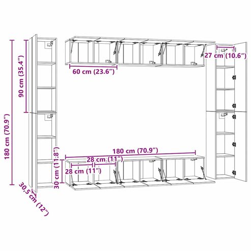 Dieses klassische TV-Schrank-Set wird mit seinem trendigen und dennoch praktischen Design zum Mittelpunkt deines Wohnzimmers. Robustes Material: Holzwerkstoff ist ein Material von außergewöhnlicher Qualität mit glatter Oberfläche, das sich durch Festigkeit, Stabilität und Feuchtigkeitsbeständigkeit auszeichnet.Viel Stauraum: Jeder TV-Schrank bietet reichlich Stauraum, um all deine Zeitschriften, DVDs und andere Gegenstände gut organisiert aufzubewahren.Wandmontage: Die TV-Konsole nimmt keine Bodenfläche ein, da sie sich einfach an der Wand befestigen lässt. Hinweis:Schrauben und Dübel für die Wandbefestigung sind nicht enthalten. Suchen und verwenden Sie die für Ihre Wände geeigneten Schrauben und Dübel. Wenn Sie unsicher sind, suchen Sie professionelle Hilfe. Lesen und befolgen Sie jeden Schritt der Anleitung sorgfältig.Jedes Produkt wird mit einer Montageanleitung in der Verpackung für eine einfache Montage geliefert. ** Farbe: Grau Sonoma ** Material: Holzwerkstoff ** Abmessungen (S): 60 x 30 x 30 cm (B x T x H) ** Abmessungen (L): 30,5 x 30 x 90 cm (B x T x H) Lieferung umfasst: ** 6 x TV-Schrank (S) ** 4 x TV-Schrank (L)