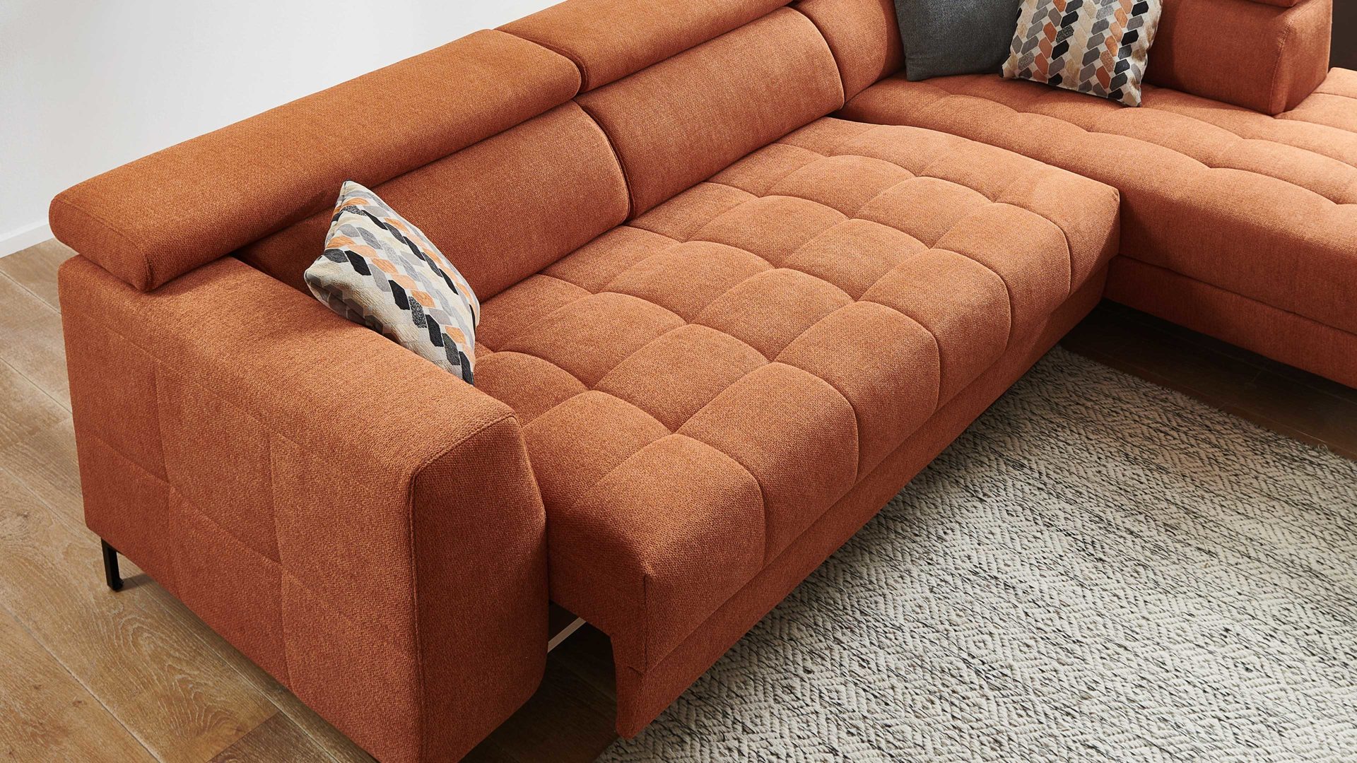 Ein Highlight des Programms 7567 sind die drei verschiedenen Sitzqualitäten: Polyätherschaum, Polyätherschaum mit Kaltschaum weich oder Kaltschaum. Sie haben die Wahl, welche Sitzqualität am besten zu Ihnen passt. Des Weiteren können Sie zwischen zwei Fußfarben wählen und die Polsterecke ist standardmäßig mit einer Kopfteilverstellung ausgestattet. Optional ist auch eine motorische Vorziehfunktion mit Einbauschalter erhältlich. Dabei haben Sie die Wahl zwischen chrom oder schwarz, bei Zweisitzern mit Armteil ist sogar ein USB-Anschluss integriert.