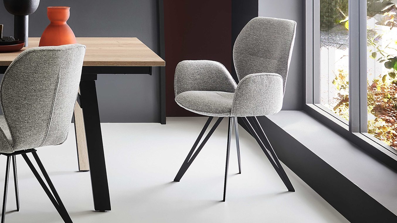 grau melierter Bouclébezug, kombiniert mit mattschwarzem Eisen