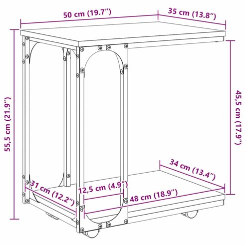 Der C-förmige Beistelltisch mit Rollen bringt rustikalen Flair in dein Wohnzimmer. Er ist sowohl praktisch als auch stylisch. Die warme Oberfläche und die kompakte Größe sind perfekt für kleine Räume, wo jeder Zentimeter zählt. Mit den verstellbaren Rollen lässt er sich leicht bewegen und bietet Platz für Drinks, Lampen oder Deko. Der Metallrahmen und die Holzwerkstoff-Oberfläche sorgen für Langlebigkeit und Qualität ohne Abstriche in der Optik. Materialzusammensetzung: Der Tisch hat eine klassische Holzwerkstoff-Oberfläche und einen robusten, pulverbeschichteten Metallrahmen. Diese Kombination sorgt für Stabilität und einen anhaltenden Charme und die matte Oberfläche passt gut zu rustikalen Einrichtungsstilen. Hochwertige Materialien stellen sicher, dass er dem täglichen Gebrauch standhält und sein elegantes Aussehen über Jahre behält. Integrierte Stauraumlösungen: Mit den Brett-Regalen bietet der Tisch praktischen Stauraum, der für Ordnung sorgt und den Nutzen maximiert. Dort finden Bücher, Zeitschriften oder Dekoartikel Platz – Stil und Bequemlichkeit vereint, was das Gesamtbild deines Wohnraums aufwertet. Robuste Bauweise: Der stabile Metallrahmen gibt dem Tisch die nötige Festigkeit. Die Pulverbeschichtung schützt und sieht gleichzeitig gut aus, harmoniert perfekt mit der Holzfläche. Das durchdachte Design ist ideal für den intensiven Gebrauch in gemütlichen und belebten Haushalten. Multifunktionales Design: Das C-förmige Design und die Rollen setzen Akzente und erfüllen viele Bedürfnisse. Perfekt, um dein Lieblingsgetränk neben dem Sessel oder als Begleiter zur Couch zu platzieren – du hast immer alles griffbereit. Pflegehinweise: Um Glanz und Langlebigkeit zu erhalten, einfach mit einem feuchten Tuch abwischen. Vermeide scharfe Chemikalien oder Scheuermittel, um die Oberfläche zu schonen, damit dieser Tisch ein schicker Teil deines Raumes bleibt. ** Farbe: Schwarz Eichen-Optik ** Material: Holzwerkstoff ** Gesamtabmessungen: 50 x 35 x 55,5 cm (L x B x H) ** Gewicht: 5 kg ** Stauraum ** Langlebig ** mit 1 Regal ** mit 4 Rädern ** Rahmenmaterial: Metall ** Drinnen & Draußen: Nur für den Innenbereich ** Lieferumfang: ** 1 x beistelltisch ** Montage erforderlich: Ja