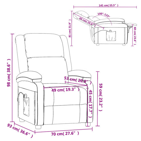 Lehne dich zurück und entspanne dich in diesem äußerst bequemen Fernsehsessel! Elektrische Liegefunktion: Der Relaxsessel ist mit einem Elektromotor für die Liegefunktion ausgestattet. Er bietet 3 Liegepositionen und die Rückenlehne und das Fußteil lassen sich über die mitgelieferte 2-Tasten-Fernbedienung je nach Bedarf einstellen.Bequemes Sitzerlebnis: Die dick gepolsterte Sitzfläche, die Rückenlehne und die breiten Armlehnen sorgen für ein behagliches und wohliges Sitzgefühl. Der Bezug aus Stoff hat ein schlichtes und sauberes Aussehen, ist atmungsaktiv und langlebig.Solider und stabiler Rahmen: Der Rahmen aus Holz und Metall sorgt für eine solide Struktur und hohe Stabilität. Dieser TV-Sessel ist bequem und langlebig. ** Farbe: Weinrot ** Material: Stoff (100% Polyester), Metall, Sperrholz, Kunststoff ** Füllung: Schaumstoff ** Gesamtabmessungen: 70 x 93 x 98 cm (B x T x H) ** Abmessungen in Liegeposition: 70 x 141 x 81 cm (B x T x H) ** Sitzfläche: 49 x 53 cm (B x T) ** Sitzhöhe vom Boden: 45 cm ** Armlehnenhöhe vom Boden: 59 cm ** Verstellbare Rückenlehne und Fußstütze ** Eingang: 100 - 240 V~, 50 - 60 Hz ** Ausgang: DC 28 V ** Zusammenbau erforderlich: Ja Dieses Gerät ist nicht dafür bestimmt, von Personen (einschließlich Kindern) mit eingeschränkten physischen, sensorischen oder geistigen Fähigkeiten oder mangelnder Erfahrung und mangelndem Wissen benutzt zu werden, es sei denn, sie werden von einer für ihre Sicherheit verantwortlichen Person beaufsichtigt oder in der Benutzung des Geräts unterwiesen. Dieses Produkt ist kein Spielzeug. Erlaube Kindern nicht, mit dem Gerät zu spielen.