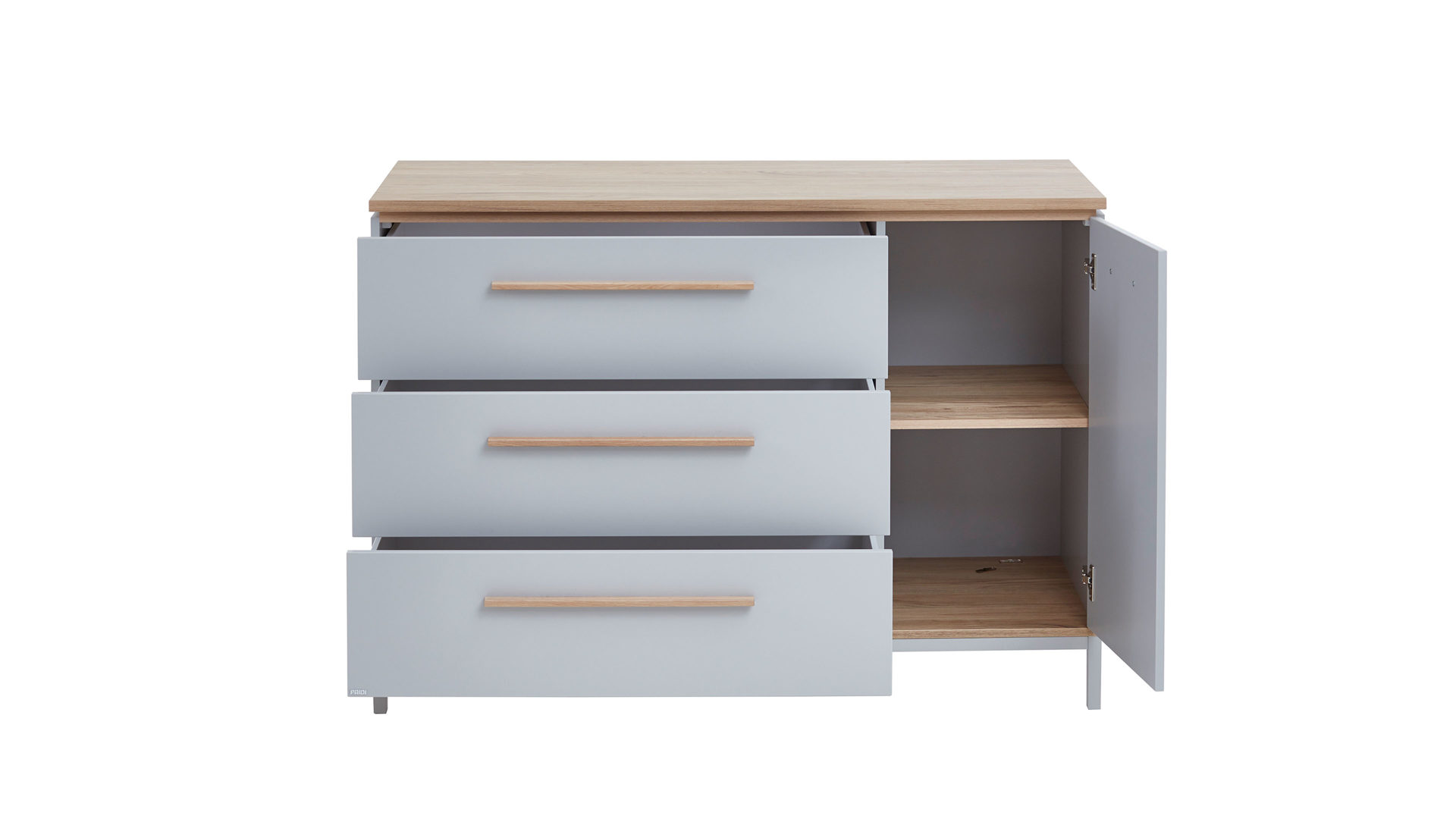 Die hochwertige PAIDI Kombikommode Benne verbindet Montana-Eiche-Nachbildung mit kieselgrauen Melaminoberflächen. Letztere zeichnen sich vor allen Dingen durch ihre Lichtechtheit sowie die besonders ausgeprägte Kratz- und Stoßfestigkeit aus. Darüber hinaus sind sie sehr pflegeleicht. Der Holzton verströmt warmen, natürlichen Charme und harmoniert wunderbar mit dem Kieselgrau. Zusammen sorgen die Nuancen für eine moderne und elegante Optik. Holzfarbene Griffleisten runden das Design stilsicher ab.