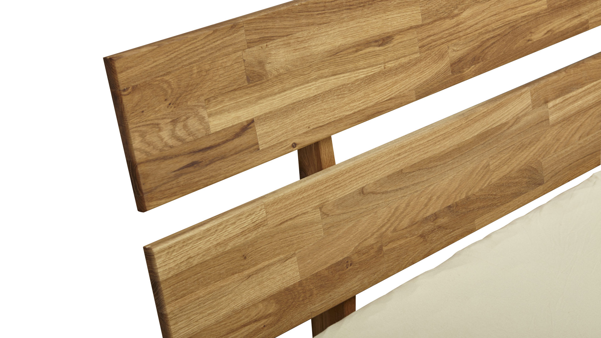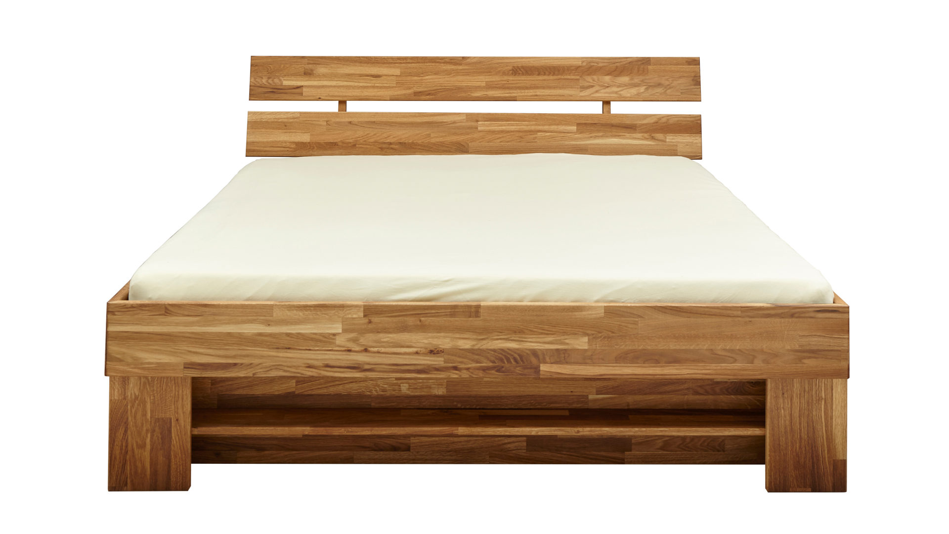 Aus keilverzinkter geölter Wildeiche gefertigt, besticht das Doppelbettgestell mit einer großzügigen Liegefläche von ca. 180 x 200 cm (BxL) sowie einem praktischen Regalboden im Fußteil. Weiteren Stauraum bieten die vier Bettkästen auf Rollen, die ca. 78 x 18 x 64 cm (BxHxT) groß sind und jede Menge Stauraum für Bettbezüge, Kissen und Decken schaffen.