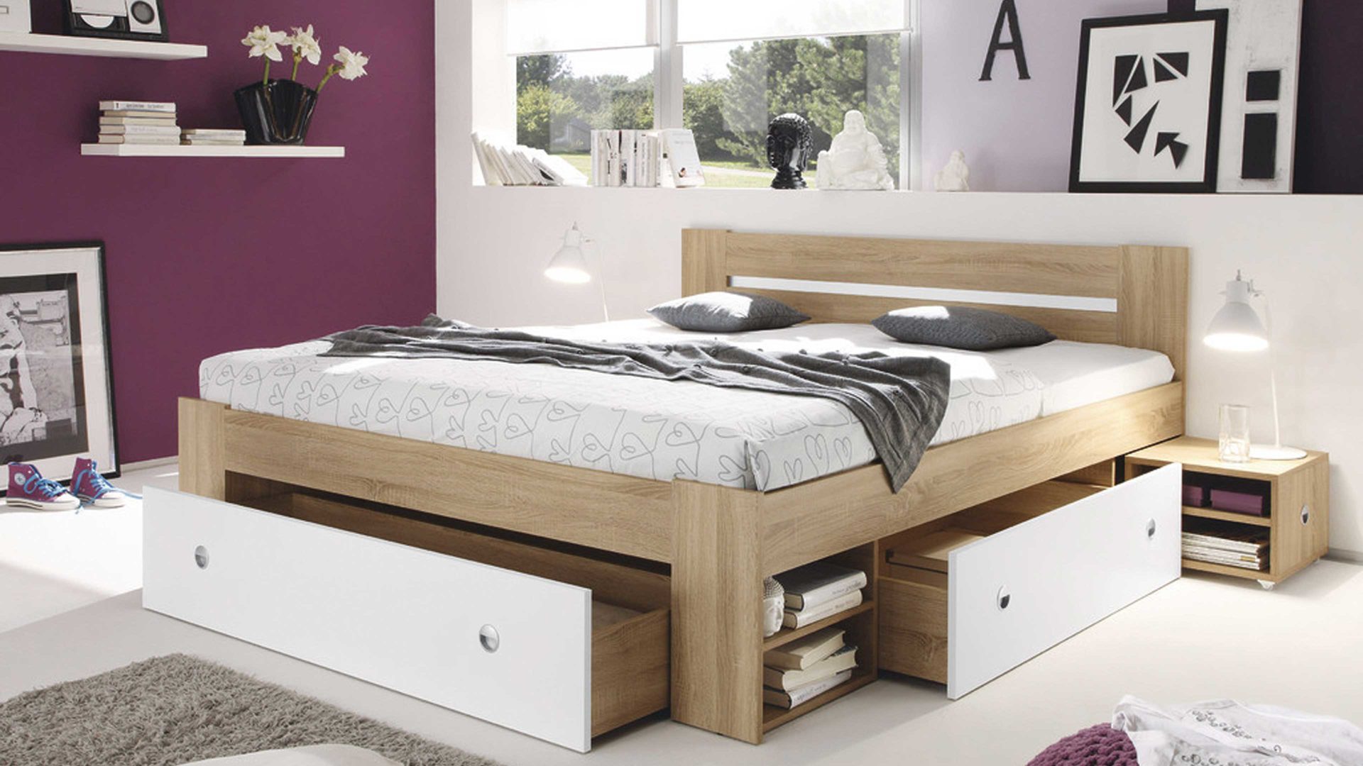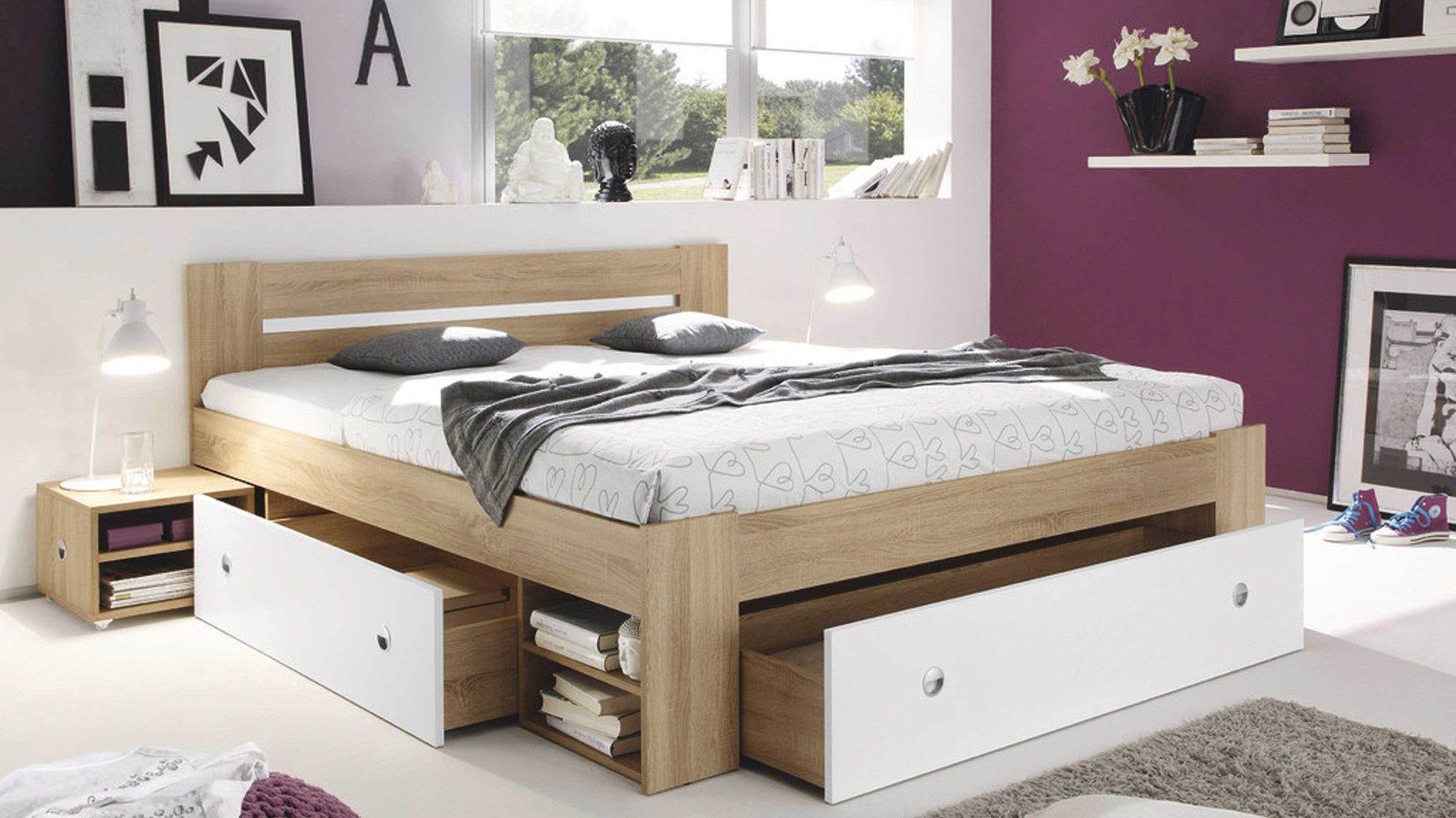 Apropos Griffe: Das Bettgestell ist mit drei Schubladen ausgestattet, in denen etwa Bettwäsche sowie Ersatz-Bettdecken und Ersatz-Kissen licht- und staubgeschützt Platz finden. Überdies beherbergt das Bett insgesamt vier offene Fächer - jeweils zwei auf der linken und rechten Bettseite. Das ist noch immer nicht alles, was dieses Bettgestell an Stauraum zu bieten hat: Es wird mit zwei Nachtkommoden geliefert, die je zwei offene Fächer mit sich bringen. Auch auf den Oberböden der Konsolen lassen sich diverse Gegenstände platzieren - beispielsweise eine Nachttischlampe und Taschentücher oder das Buch, das aktuell gelesen wird.