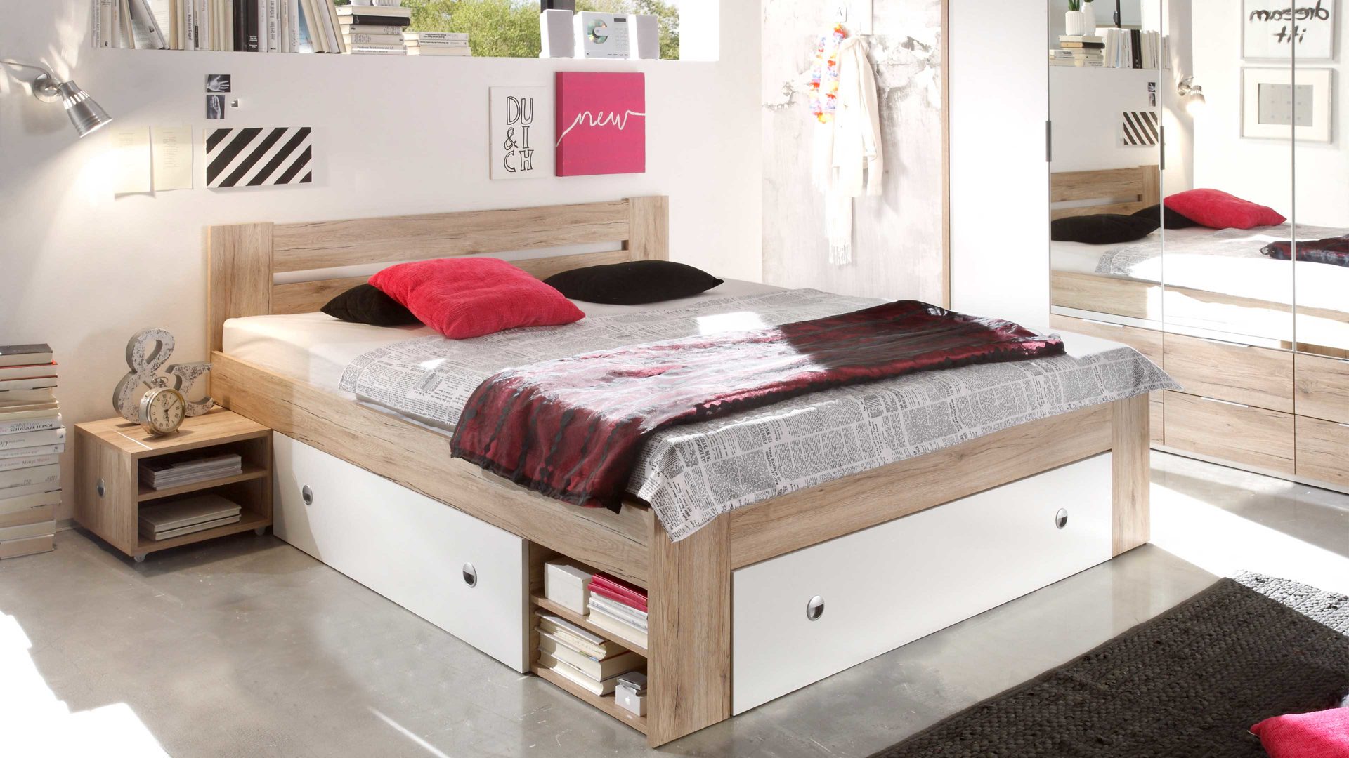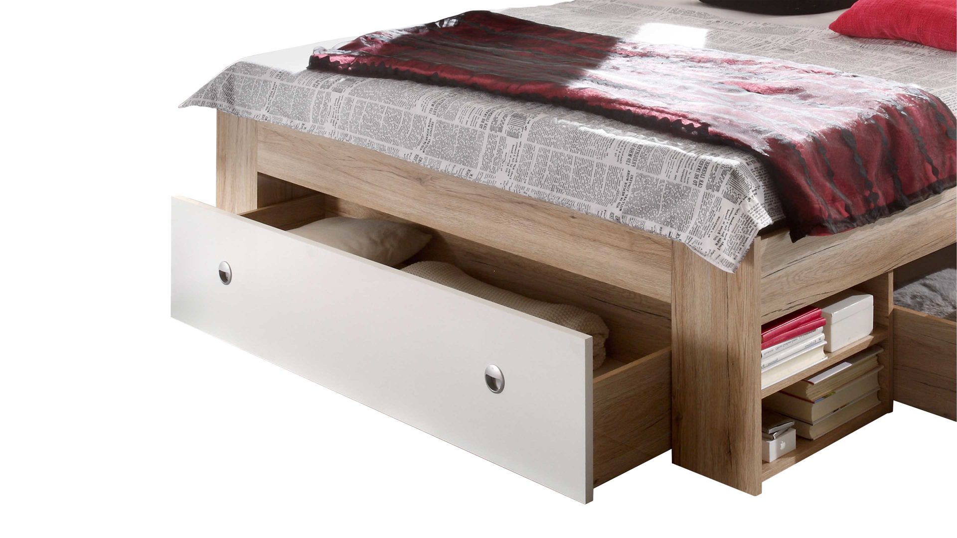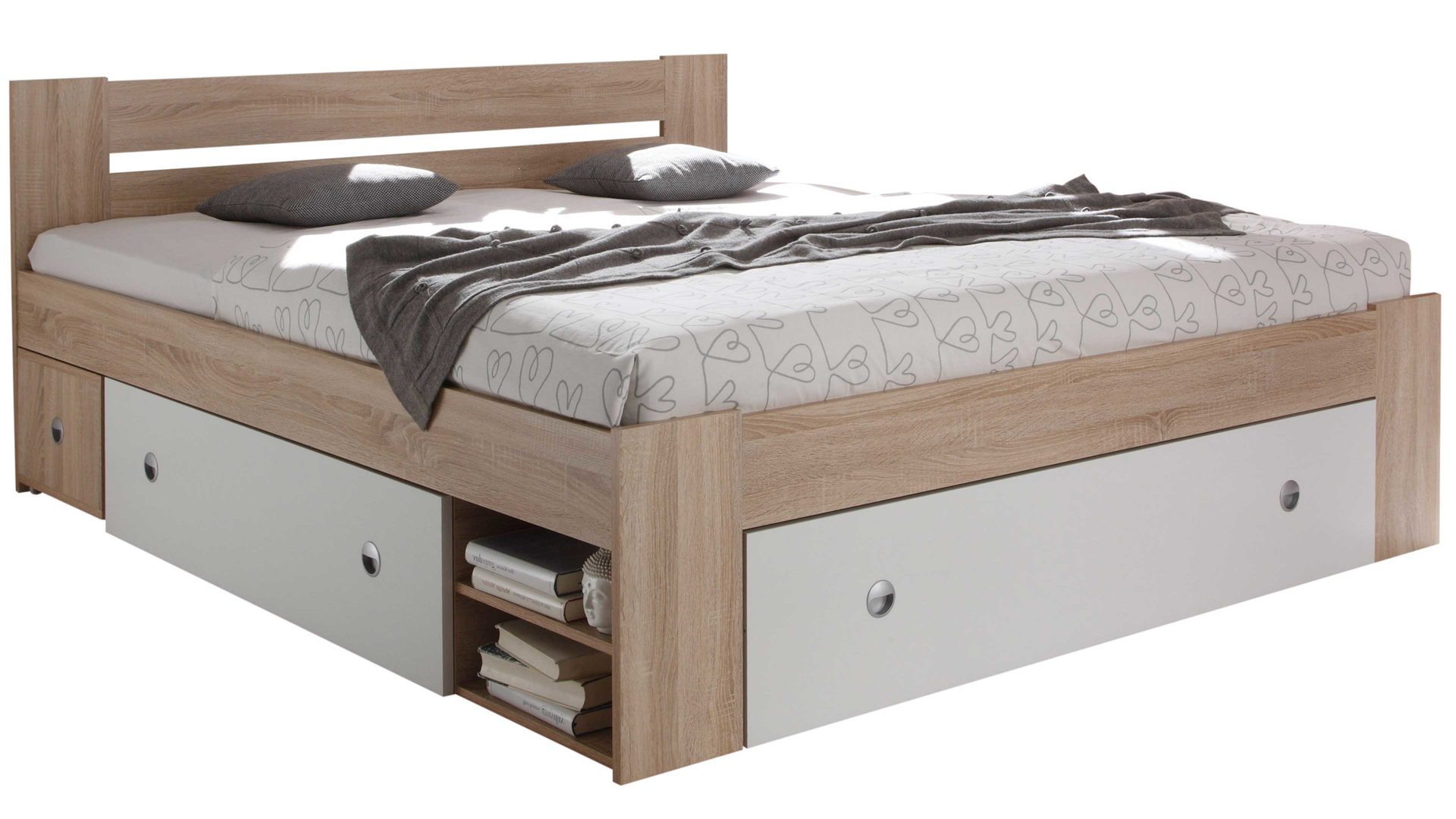 Apropos Griffe: Das Bettgestell ist mit drei Schubladen ausgestattet, in denen etwa Bettwäsche sowie Ersatz-Bettdecken und Ersatz-Kissen licht- und staubgeschützt Platz finden. Überdies beherbergt das Bett insgesamt vier offene Fächer - jeweils zwei auf der linken und rechten Bettseite. Das ist noch immer nicht alles, was dieses Bettgestell an Stauraum zu bieten hat: Es wird mit zwei Nachtkommoden geliefert, die je zwei offene Fächer mit sich bringen. Auch auf den Oberböden der Konsolen lassen sich diverse Gegenstände platzieren - beispielsweise eine Nachttischlampe und Taschentücher oder das Buch, das aktuell gelesen wird.