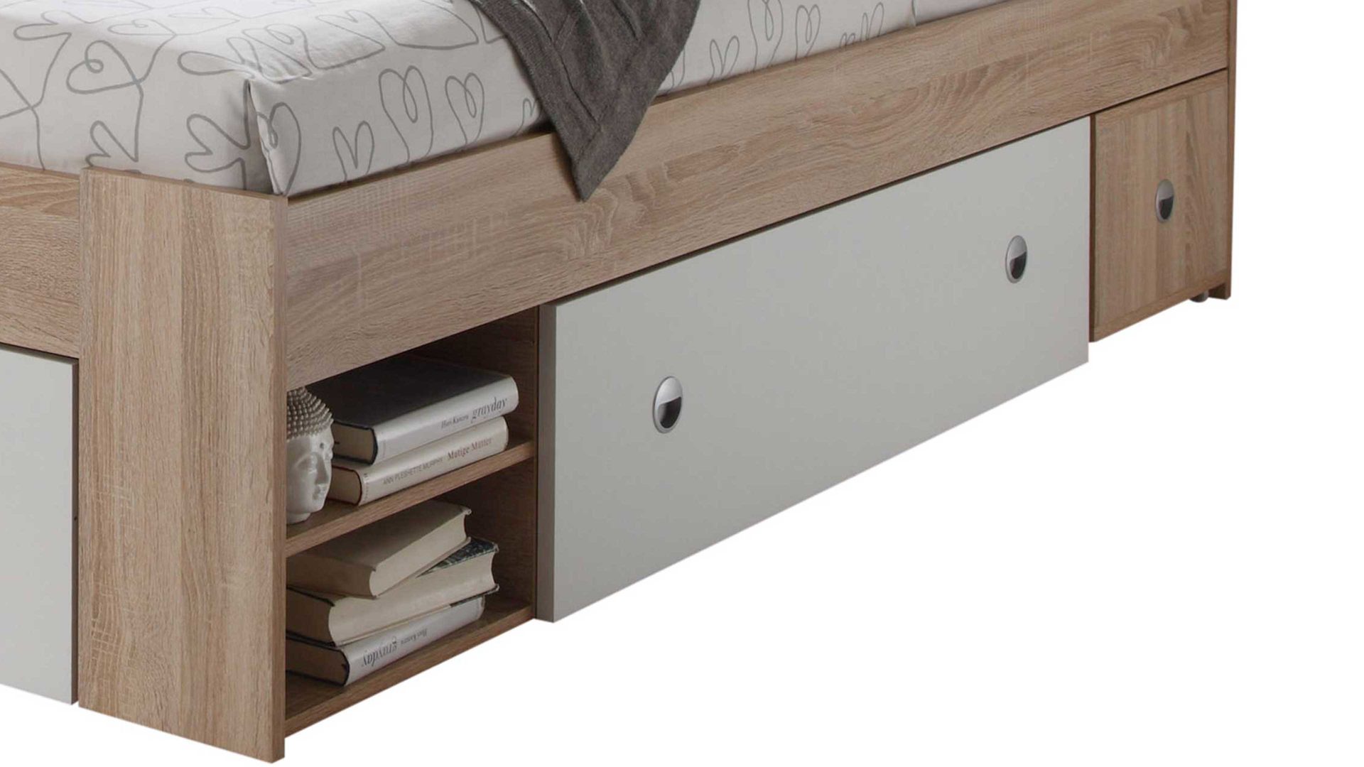 Apropos Griffe: Das Bettgestell ist mit drei Schubladen ausgestattet, in denen etwa Bettwäsche sowie Ersatz-Bettdecken und Ersatz-Kissen licht- und staubgeschützt Platz finden. Überdies beherbergt das Bett insgesamt vier offene Fächer - jeweils zwei auf der linken und rechten Bettseite. Das ist noch immer nicht alles, was dieses Bettgestell an Stauraum zu bieten hat: Es wird mit zwei Nachtkommoden geliefert, die je zwei offene Fächer mit sich bringen. Auch auf den Oberböden der Konsolen lassen sich diverse Gegenstände platzieren - beispielsweise eine Nachttischlampe und Taschentücher oder das Buch, das aktuell gelesen wird.