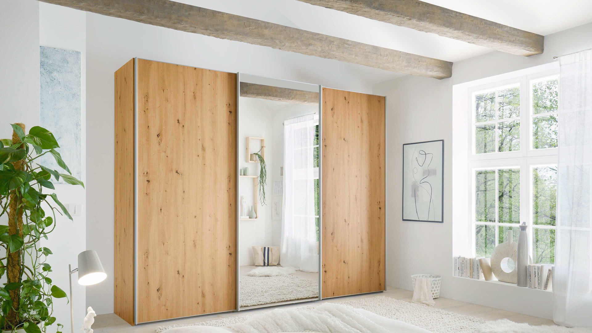 zwei Holztüren, eine Spiegeltür