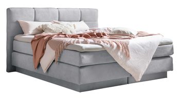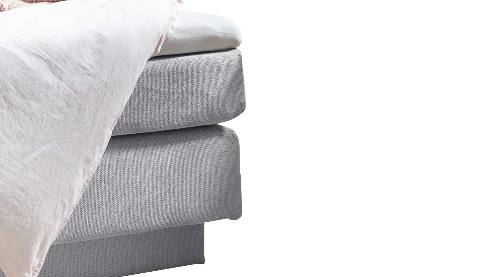 Mit seinem stilvollen silbergrauen Stoffbezug strahlt das hochwertige Boxspringbett Portage moderne Eleganz aus. Ein optisches Highlight bildet auch das Polsterkopfteil mit den markanten Heftungen und Doppelziernähten. Die Rückseite ist mit Spinnvlies bezogen.