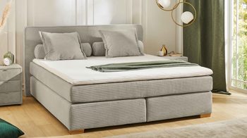 Das Boxspringbett Romy kombiniert einen trendy greigen Breitcordbezug mit hellen Holzfüßen für ein modernes und gemütliches Design. Dank des Boxspring-Aufbaus gewährleistet es eine optimale Körperanpassung und Druckentlastung.
