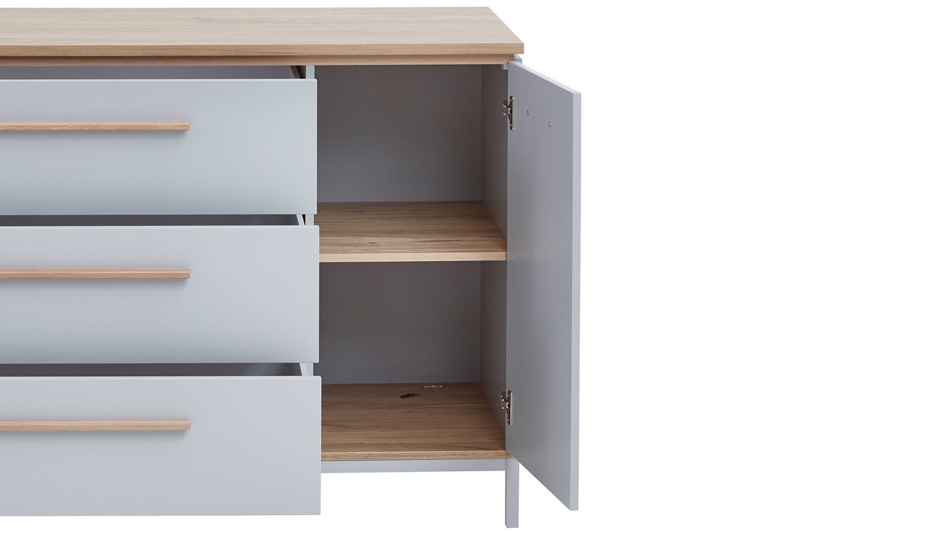 Die hochwertige PAIDI Kombikommode Benne verbindet Montana-Eiche-Nachbildung mit kieselgrauen Melaminoberflächen. Letztere zeichnen sich vor allen Dingen durch ihre Lichtechtheit sowie die besonders ausgeprägte Kratz- und Stoßfestigkeit aus. Darüber hinaus sind sie sehr pflegeleicht. Der Holzton verströmt warmen, natürlichen Charme und harmoniert wunderbar mit dem Kieselgrau. Zusammen sorgen die Nuancen für eine moderne und elegante Optik. Holzfarbene Griffleisten runden das Design stilsicher ab.