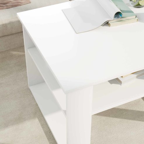 Dieser moderne Couchtisch bringt stilvolle Eleganz und praktische Funktionalität in zeitgenössische Wohnzimmer. Seine rechteckige Form und klaren Linien machen ihn super vielseitig und wertvoll für jede Einrichtung. Der Tisch bietet eine praktische Fläche für Drinks, Magazine und Deko und bringt gleichzeitig frischen modernen Chic in dein Zuhause. Robuste Bauweise und schlankes Design machen ihn ideal für alle, die Wert auf Funktionalität und Style legen. Als zentraler Punkt des Raums lädt er gesellig zu Gesprächen ein und schafft eine einladende Atmosphäre für Familie und Freunde. Materialien: Der Tisch ist aus Holzwerkstoff, der die perfekte Kombination aus Langlebigkeit und schicker Optik bietet. Das Material sorgt für eine stabile Basis, die im Alltag standhält. Seine glatte Oberfläche lässt ihn elegant aussehen, was ihn zu einer tollen Ergänzung für jedes Wohnzimmer macht. Enthaltene Komponenten: Der Couchtisch kommt mit praktischen Regalbrettern aus Holzwerkstoff, die eine einfache, aber effektive Lösung zur Aufbewahrung bieten. Hier kannst du alles unterbringen – ob Magazinen oder Fernbedienungen, damit der Tisch aufgeräumt bleibt. Eigenschaften / Funktion / Design: Das schlichte, moderne Design fügt sich problemlos in die aktuelle Wohnumgebung ein und wertet die Räumlichkeiten auf. Der minimalistische Stil sorgt dafür, dass der Platz effizient genutzt wird – ideal für Stadtwohnungen oder kleine Räume, wo jeder Quadratmeter zählt. Empfohlene Anwendungen: Dieser Tisch ist perfekt für Wohnzimmer und eignet sich hervorragend für gesellige Treffen und entspannte Runden. Seine proportionierten Maße ermöglichen eine vielseitige Nutzung – ob als Ablagefläche für Kaffee oder als Showpiece für schöne Deko, er vereint Funktionalität mit Stil. Pflege & Wartung: Um sein glänzendes Aussehen zu bewahren, vermeide scharfe Chemikalien beim Reinigen. Ein einfaches Abwischen mit einem trockenen Tuch genügt. Stelle sicher, dass du ihn gemäß den Anleitungen zusammenbaust – du brauchst dafür nur einen Schraubendreher. ** Farbe: Weiß ** Material: Holzwerkstoff ** Rahmenmaterial: Holzwerkstoff ** Gesamtabmessungen: 64 x 54 x 44 cm (L x B x H) ** Langlebig ** Montage erforderlich: Ja ** Lieferumfang: ** 1 x couchtisch