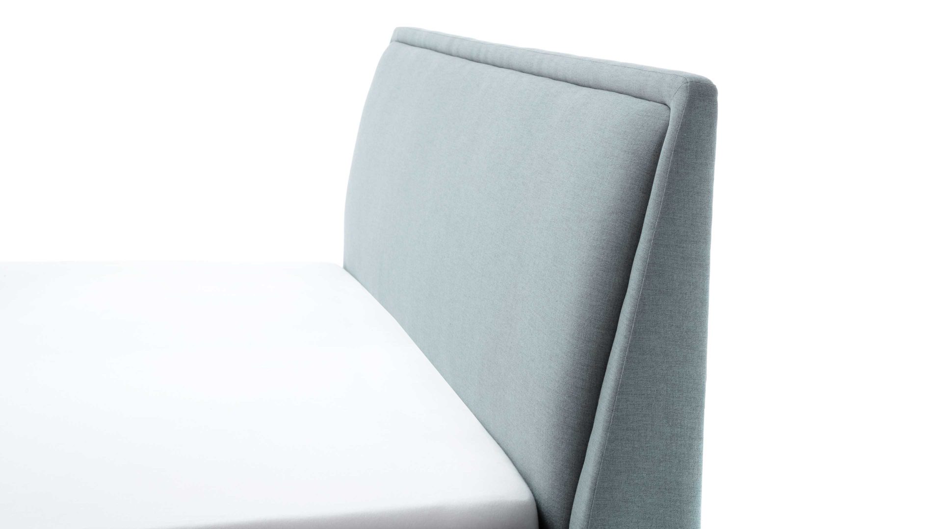 Das Polsterbettgestell Frieda mit Bettkasten verkörpert modernen Komfort. Mit dem eisblauen Stoffbezug und den schwarzen Holzfüßen präsentiert es sich elegant und gemütlich designt. Die Bettseiten sind genauso wie das Polsterkopfteil glatt bezogen. Letzteres ist eine angenehm weiche Rückenlehne, wenn Sie abends im Bett vor dem Schlafen noch entspannt in Ihrem Buch lesen oder fernsehen möchten.