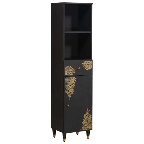 Dieses Holz-Badezimmerschrank-Set verbindet praktische Funktionalität mit einem schicken rustikalen Look, perfekt für alle, die den natürlichen Charme ihrer Einrichtung lieben. Aus massivem Mango-Holz gefertigt, strahlt das Set in einem natürlichen Erdtatton, der durch das goldene Siebdruckdesign aufgefrischt wird. Super vielseitig und ideal für alle Badezimmerstile, bietet es viel Stauraum für eine bessere Raumausnutzung. Perfekt für Hausbesitzer, die Ordnung und eine ansprechende Optik schätzen, vereint dieses Set Nützlichkeit und Stil. Materialien: Das Schrank-Set ist aus massivem Mango-Holz und Holzwerkstoffen gefertigt und bietet damit eine robuste Haltbarkeit. Das Mango-Holz gibt jedem Badezimmer eine schöne, natürliche Textur und schafft eine rustikale Atmosphäre. Die Holzwerkstoffteile bewahren die Form und stellen sicher, dass es auch langfristig elegant bleibt, selbst bei täglichem Gebrauch. Inklusive Komponenten: Das Set enthält einen Waschbeckenschrank (62 x 33 x 58 cm), einen hohen Schrank (38 x 33,5 x 160 cm) und einen wandmontierten Spiegel (50 x 70 x 3 cm). Jedes Teil ist auf optimale Funktionalität ausgelegt und bietet gut organisierten Stauraum, der die Benutzerfreundlichkeit in deinem Bad verbessert. Merkmale/Funktion/Design: Mit schönen goldenen Siebdruckdesigns und Messinggriffen passt dieses Schrank-Set perfekt zu deinem Sinn für stilvolle Eleganz. Die Türen sorgen für mehr Privatsphäre und Sicherheit und ermöglichen eine perfekte Kombination aus Stil und Nützlichkeit, auch in kleineren Räumen. Montage und Stauraum: Das wandmontierte Design spart Platz auf dem Boden und ist ideal für kleine Badezimmer. Mit einer cleveren Fächeraufteilung bleibt dein Bad ordentlich und aufgeräumt. Montage und Pflege: Das Zusammenbauen des Sets ist einfach und benötigt nur wenige Werkzeuge. Pflegeleicht – ein trockenes Tuch reicht zum Wischen, um das elegante Schrank-Set in Topform zu halten. ** Farbe: Schwarz ** Material: Massivholz Mango ** Gesamtabmessungen: 62 x 33 x 58 cm (L x B x H) ** Stauraum ** Mit goldfarbigem Siebdruckdesign ** Mit Tür ** Mit Messingknöpfen ** Mit Schublade ** Flachspiegel ** mit 3 Türen ** Innen- / Außenbereich: Nur für den Innenbereich ** Lieferumfang: ** 1 x Waschbeckenunterschrank: 62 x 33 x 58 cm (LxBxH) ** 1 x Spiegel: 50 x 70 x 3 cm (LxBxH) ** 1 x Schrank: 38 x 33,5 x 160 cm (LxBxH) ** Montage erforderlich: Ja