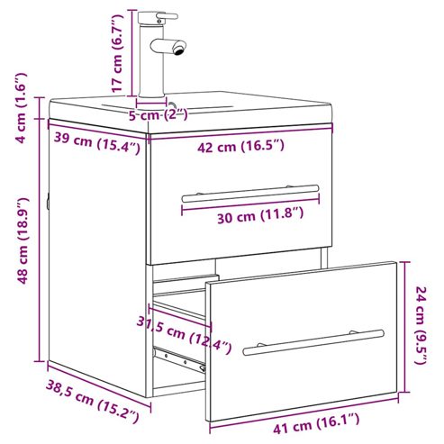 Dieser moderne Waschbeckenunterschrank ist ein echter Hingucker in jedem Badezimmer. Mit seinem schlanken Design und der hohen Funktionalität passt er perfekt in zeitgemäße Räume. Seine schlichte rechteckige Form sorgt für praktische Aufbewahrung, mit klaren Linien und einem luftigen, offenen Gefühl. Stell dir ein Badezimmer vor, das stilvoll und gleichzeitig praktisch ist, und in dem du genügend Stauraum für alles hast. Holzwerkstoff & Keramik: Der Schrank ist aus hochwertigem Holzwerkstoff, der Stabilität und ansprechendes Design bietet. Die keramische Oberfläche sieht nicht nur schick aus, sondern ist auch super leicht zu reinigen, was zu einem tollen Badezimmer beitragen wird. Moderne Stauraumkomponenten: Der Schrank hat schicke Bar- und traditionelle Schubladengriffe. Mehrere Fächer und Schubladen machen es leicht, Badezimmerartikel von Toilettenpapier bis Handtüchern zu organisieren und so deinen Raum ordentlich zu halten. Platzsparende Wandmontage: Durch die Wandmontage sieht dein Badezimmer sauber und aufgeräumt aus und der Boden bleibt frei. Diese Lösung passt perfekt in Badezimmer jeder Größe und verbindet Stil und praktische Nutzung. Funktionale Merkmale: Eine tolle Mischung aus Einfachheit und Technik: Das wandmontierte Design und die einfachen Griffe machen die Nutzung einfach und bequem. So erledigst du deine täglichen Aufgaben im Badezimmer schnell und unkompliziert. Einfache Pflege & Wartung: Ein feuchtes Tuch reicht, um den Schrank in Topform zu halten. Die Materialwahl schützt vor scharfen Chemikalien und sorgt so für ein besseres Badeerlebnis. ** Farbe: Schwarz Eichen-Optik ** Material: Engineered Holz und Keramik ** Gesamtabmessungen: 41 x 38,5 x 48 cm (L x B x H) ** Gewicht: 17,68 kg ** Stauraum ** Mit Schublade ** Rahmenmaterial: Holzwerkstoff ** Innen- / Außenbereich: Nur für den Innenbereich ** Montage erforderlich: Ja