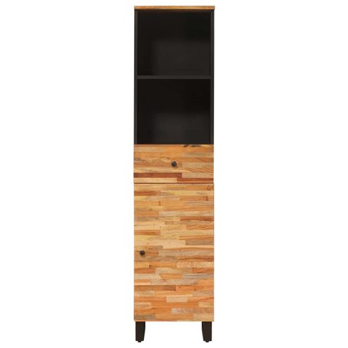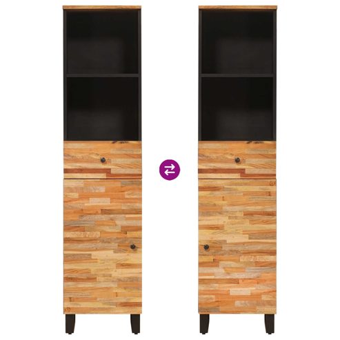 Dieser moderne Badschrank kombiniert Einfachheit mit Funktionalität – eine schicke Aufbewahrungslösung für zeitgemäße Badezimmer. Mit klaren Linien und einem natürlichen Braun ergänzt er jede Badezimmeratmosphäre toll. Egal ob über dem Waschbecken hängend oder freistehend, er bringt Stil und hilft dir, Toilettenartikel ordentlich und griffbereit zu halten. Massivholz Mango: Dieser Schrank aus massivem Mangoholz ist super langlebig und hat eine schöne Holzmaserung, die eine warme Atmosphäre schafft. Das Holz ist stark und robust, sodass der Schrank auch beim täglichen Gebrauch charismatisch bleibt. Modernes Design: Die klaren Linien und neutralen Farben passen problemlos zu verschiedenen Einrichtungsstilen, ob modern oder traditionell. Seine schlichte Eleganz macht ihn zum echten Hingucker in jedem Badezimmer. Vielseitige Stauraumoptionen: Praktisch konzipiert, hat dieser Schrank mehrere Regale und Fächer für die Aufbewahrung von Handtüchern, Toilettenartikeln und Reinigungsmitteln. Das durchdachte Layout nutzt den verfügbaren Platz optimal, damit das Badezimmer ordentlich bleibt. Einfacher Aufbau: Mit einem Schraubendreher und zwei Personen ist der Schrank leicht zusammenzubauen. Die klaren Anleitungen und gekennzeichneten Teile machen den Aufbau einfach, sodass du deine neue Badezimmeraufbewahrung schnell genießen kannst. Problemloses Pflegen: Um den Schrank schön zu halten, musst du nur mit einem feuchten Tuch drüberwischen, um Staub und Flecken zu entfernen – so bleibt er elegant ohne großen Aufwand. ** Farbe: Artisan-Eiche ** Material: Massivholz Mango ** Gesamtabmessungen: 38 x 33 x 160 cm (L x B x H) ** mit 1 Schublade ** mit 1 Regal ** mit 1 Tür ** Nur für den Innenbereich ** Lieferumfang: ** 1 x Badezimmer Schrank ** Montage erforderlich: Ja