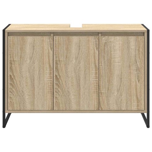 Dieser industrielle Badezimmer-Schrank aus Holzwerkstoff ist vielseitig einsetzbar und bietet eine klasse Kombination aus Optik und Handlung. Mit seinem schlanken, rechteckigen Design passt er perfekt in moderne Bäder und bietet dir viel Platz, um Handtücher, Toilettenartikel und andere Notwendigkeiten ordentlich zu verstauen. Struktur aus Holzwerkstoff Der Schrank ist aus hochwertigem Holzwerkstoff gemacht, was ihn stabil und robust macht. Die widerstandsfähige Oberfläche ist perfekt für das feuchte Badezimmerklima. So passt er gut in dein Bad und bietet gleichzeitig einen stilvollen Akzent. Stahlbeine Der Schrank hat stabile Stahlbeine, die für eine sichere Basis sorgen. Sie erhöhen nicht nur die Haltbarkeit, sondern verleihen dem Design auch einen coolen Industrie-Look. Diese Beine verlängern die Lebensdauer des Produkts und sehen dabei gut aus. Rechteckiges Design Das praktische rechteckige Design des Schranks nutzt den Platz optimal und ist somit top für kleinere Badezimmer. Er passt super in jeden Raum und bietet viel Stauraum für Badezimmerutensilien – so bleibt alles ordentlich. Montagevorgang Der Schrank kann mit einem Schraubendreher von zwei Personen montiert werden, um Stabilität und Haltbarkeit zu gewährleisten. Eine leicht verständliche Anleitung führt dich Schritt für Schritt durch den Aufbau und sorgt für eine problemlose Montage. Nur für den Innenbereich Dieser Schrank ist für den Innenbereich gedacht, um eine konsistente und zuverlässige Stauraumlösung in deinem Badezimmer zu bieten. Er wurde speziell für häusliche Anwendungen entwickelt und ist ein unverzichtbares Möbelstück für dein Bad. ** Farbe: Sonoma ** Material: Holzwerkstoff ** Gesamtabmessungen: 90 x 30 x 60 cm (L x B x H) ** Gewicht: 22,21 kg ** Langlebig ** Rahmenmaterial: Holzwerkstoff ** mit 3 Türen ** Innen- / Außenbereich: Nur für den Innenbereich ** Lieferumfang: ** 1 x Badezimmerunterschrank ** Montage erforderlich: Ja