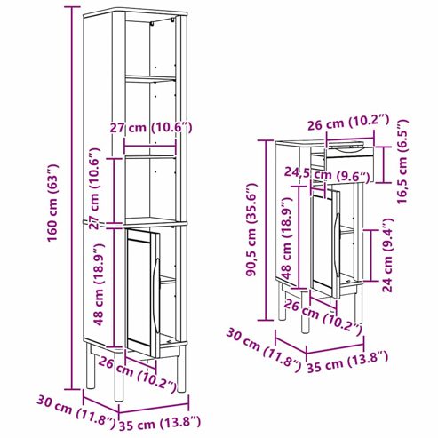 Dieses moderne Badezimmermöbelset wurde so designt, dass es jedem Badezimmer einen eleganten, nahtlosen Look verleiht. Ideal für den täglichen Gebrauch, bietet es sowohl Stil als auch praktische Funktionalität und sorgt für eine ruhige, organisierte Umgebung. Mit einer eleganten, rechteckigen Form und modernem Oberflächenfinish passt das Set super zu zeitgenössischen Dekoren. Die massiven Kiefernholz-Konstruktion bringt zeitlose Haltbarkeit. Perfekt für alle, die Einfachheit und innovative Stauraumlösungen wertschätzen, verkörpert dieses Set minimalistischen Stil, der an verschiedene Geschmäcker angepasst werden kann. Fühl dich tagtäglich in einem harmonischen Rückzugsort wohl. Massivholz Kiefer Hergestellt aus massivem Kiefernholz, bringt dieses Badezimmermöbelset eine tolle Mischung aus Stabilität und ansprechendem Design. Alles – vom Rahmen über die Griffe bis zur Rückwand – ist sorgfältig verarbeitet, um Robustheit sicherzustellen. Die schöne Maserung des Materials bringt Natur-Look in dein Badezimmer. Anpassbare Stauraumlösungen Mit verstellbaren Regalen passt sich das Möbelset perfekt an deine Stauraumbedürfnisse an. Diese Flexibilität hilft dir, all deine Essentials ordentlich zu organisieren und die Nützlichkeit deines Badezimmers zu maximieren. Modernes minimalistisches Design Mit klaren Linien und Kantengriffen verkörpert das Set moderne Eleganz. Und die Türscharniere sind auch voll funktionsfähig. Ideal für alle, die auf Funktionalität Wert legen, ohne auf Stil zu verzichten. Platzsparendes Design Das wandmontierte Design schafft mehr Platz auf dem Boden und bringt ein offenes, modernes Ambiente. Diese Lösung ist perfekt für kleinere Badezimmer oder für alle, die einen luftigen Eindruck schaffen möchten. Einfach zu pflegen Nur ein einfaches Abwischen reicht aus, um die Schönheit des Möbels zu erhalten. So kannst du es viele Jahre lang genießen, mit minimalem Aufwand. ** Farbe: Wachsbraun ** Material: Massivholz Kiefer ** Gesamtabmessungen: 35 x 30 x 160 cm (L x B x H) ** Gewicht: 46,2 kg ** Langlebig ** Stauraum ** 3 Höhenverstellungen, um deinen unterschiedlichen Aufbewahrungsbedürfnissen gerecht zu werden ** mit 1 Schublade ** mit 6 Verstellbare Regale ** Rahmenmaterial: Massivholz Kiefer ** mit 5 Scharniertüren ** Nur für den Innenbereich ** Lieferumfang: ** 1 x Waschbeckenunterschrank: 60 x 40 x 80 cm (LxBxH) ** 1 x Badezimmerunterschrank: 35 x 30 x 160 cm (LxBxH) ** 1 x Badezimmerunterschrank: 35 x 30 x 90,5 cm (LxBxH) ** 1 x Wandschrank: 35 x 30 x 60 cm (LxBxH) ** Montage erforderlich: Ja