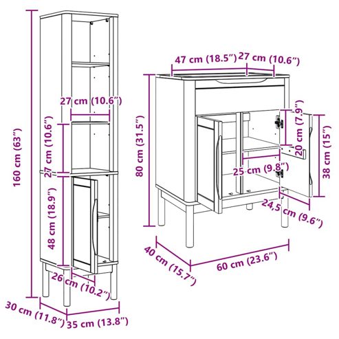 Dieses moderne Badezimmermöbelset wurde so designt, dass es jedem Badezimmer einen eleganten, nahtlosen Look verleiht. Ideal für den täglichen Gebrauch, bietet es sowohl Stil als auch praktische Funktionalität und sorgt für eine ruhige, organisierte Umgebung. Mit einer eleganten, rechteckigen Form und modernem Oberflächenfinish passt das Set super zu zeitgenössischen Dekoren. Die massiven Kiefernholz-Konstruktion bringt zeitlose Haltbarkeit. Perfekt für alle, die Einfachheit und innovative Stauraumlösungen wertschätzen, verkörpert dieses Set minimalistischen Stil, der an verschiedene Geschmäcker angepasst werden kann. Fühl dich tagtäglich in einem harmonischen Rückzugsort wohl. Massivholz Kiefer Hergestellt aus massivem Kiefernholz, bringt dieses Badezimmermöbelset eine tolle Mischung aus Stabilität und ansprechendem Design. Alles – vom Rahmen über die Griffe bis zur Rückwand – ist sorgfältig verarbeitet, um Robustheit sicherzustellen. Die schöne Maserung des Materials bringt Natur-Look in dein Badezimmer. Anpassbare Stauraumlösungen Mit verstellbaren Regalen passt sich das Möbelset perfekt an deine Stauraumbedürfnisse an. Diese Flexibilität hilft dir, all deine Essentials ordentlich zu organisieren und die Nützlichkeit deines Badezimmers zu maximieren. Modernes minimalistisches Design Mit klaren Linien und Kantengriffen verkörpert das Set moderne Eleganz. Und die Türscharniere sind auch voll funktionsfähig. Ideal für alle, die auf Funktionalität Wert legen, ohne auf Stil zu verzichten. Platzsparendes Design Das wandmontierte Design schafft mehr Platz auf dem Boden und bringt ein offenes, modernes Ambiente. Diese Lösung ist perfekt für kleinere Badezimmer oder für alle, die einen luftigen Eindruck schaffen möchten. Einfach zu pflegen Nur ein einfaches Abwischen reicht aus, um die Schönheit des Möbels zu erhalten. So kannst du es viele Jahre lang genießen, mit minimalem Aufwand. ** Farbe: Wachsbraun ** Material: Massivholz Kiefer ** Gesamtabmessungen: 35 x 30 x 160 cm (L x B x H) ** Gewicht: 28,15 kg ** Langlebig ** Stauraum ** 3 Höhenverstellungen, um deinen unterschiedlichen Aufbewahrungsbedürfnissen gerecht zu werden ** mit 4 Verstellbare Regale ** Rahmenmaterial: Massivholz Kiefer ** mit 3 Scharniertüren ** Nur für den Innenbereich ** Lieferumfang: ** 1 x Waschbeckenunterschrank: 60 x 40 x 80 cm (L x B x H) ** 1 x Badschrank: 35 x 30 x 160 cm (L x B x H) ** Montage erforderlich: Ja