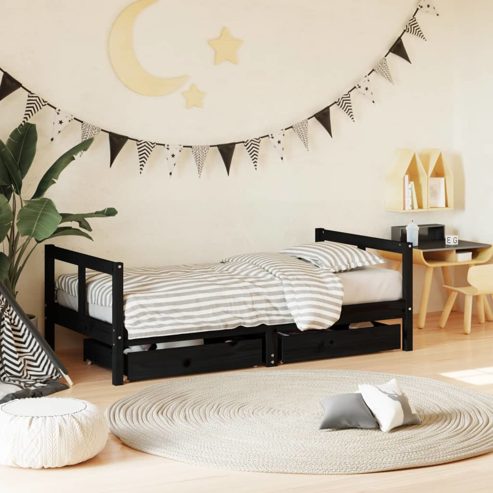 In diesem Kinderbett aus Holz genießt dein Kleiner eine erholsame Nachtruhe. Mit seinem eleganten und zeitlosen Design ist es die perfekte Wahl für deine Kinder! Massives Kiefernholz: Das Kinderbett ist aus massivem Kiefernholz gefertigt. Massives Kiefernholz ist ein wunderschönes Naturmaterial. Kiefernholz weist eine gerade Maserung auf und die Aststellen verleihen dem Material seine charakteristische, rustikale Optik.Robuste Latten: Das Kinderbett ist mit Holzlatten versehen, die für einen festen Halt, Belüftung und Stabilität sorgen.Mit Schubladen: Die mitgelieferten Schubladen bieten reichlich Platz für die Aufbewahrung von Kleinspielzeug, Kleidung und Bettzeug, um für Ordnung im Kinderzimmer zu sorgen.Praktisches Kopfteil und Fußteil: Dank des Kopf- und des Fußteils bleibt die Matratze stabil an ihrem Platz.Durchdachtes Design: Dank der geringen Höhe des Einzelbettes können Kinder leicht ins Bett ein- und aussteigen. Gut zu wissen:Bei diesem Bett ist keine Matratze im Lieferumfang enthalten. Wir bieten jedoch eine große Auswahl an Matratzen an. Du kannst in unserem Shop nach einer passenden Matratze suchen. ** Farbe: Schwarz ** Material: Massives Kiefernholz ** Gesamtabmessungen: 165,5 x 85,5 x 55 cm (L x B x H) ** Geeignete Matratzengröße: 80 x 160 cm (B x L) (Matratze nicht im Lieferumfang enthalten) ** Abmessungen der Schubladen (pro Stück): 70 x 51 x 12,5 cm (B x T x H) ** Geeignet für Kinder ab 4 Jahren ** Zusammenbau erforderlich: Ja WARNUNG! Stelle dieses Kinderbett nicht in der Nähe von Wärmequellen, Fenstern und anderen Möbeln auf. WARNUNG! Benutze dieses Kinderbett nicht, wenn ein Teil kaputt ist, gerissen ist oder fehlt.