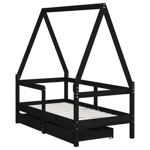 Mit diesem fantastischen Kinderbett aus Holz bietest du deinen Kleinen einen eigenen lustigen Platz! Massives Kiefernholz: Das Kinderbett ist aus massivem Kiefernholz gefertigt. Massives Kiefernholz ist ein wunderschönes Naturmaterial. Kiefernholz weist eine gerade Maserung auf und die Aststellen verleihen dem Material seine charakteristische, rustikale Optik.Robuste Latten: Das Kinderbett ist mit Holzlatten versehen, die für einen festen Halt, Belüftung und Stabilität sorgen.Design in Hausform: Dieses Kleinkinderbett weist ein durchdachtes Design mit einem Rahmen in Hausform auf, an dem du Bettvorhänge aufhängen kannst, um Privatsphäre für dein Kind zu schaffen.Mit Schubladen: Die mitgelieferten Schubladen bieten reichlich Platz für die Aufbewahrung von Kleinspielzeug, Kleidung und Bettzeug, um für Ordnung im Kinderzimmer zu sorgen.Durchdachtes Design: Dank der geringen Höhe des Einzelbettes können Kinder leicht ins Bett ein- und aussteigen. ** Farbe: Schwarz ** Material: Massives Kiefernholz ** Gesamtabmessungen: 145,5 x 75,5 x 147 cm (L x B x H) ** Passende Matratzengröße: 70 x 140 cm (B x L) (Matratze nicht im Lieferumfang inbegriffen) ** Abmessungen der Schublade ( pro Stück): 60 x 51 x 12,5 cm (B x T x H) ** Geeignet für Kinder zwischen 18 Monaten und 4 Jahren ** Zusammenbau erforderlich: Ja WARNUNG! Stelle dieses Kinderbett nicht in der Nähe von Wärmequellen, Fenstern und anderen Möbeln auf. WARNUNG! Benutze dieses Kinderbett nicht, wenn ein Teil kaputt ist, gerissen ist oder fehlt.