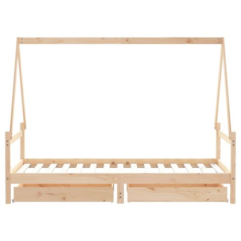 Mit diesem fantastischen Kinderbett aus Holz bietest du deinen Kleinen einen eigenen lustigen Platz! Massives Kiefernholz: Das Kinderbett ist aus massivem Kiefernholz gefertigt. Massives Kiefernholz ist ein wunderschönes Naturmaterial. Kiefernholz weist eine gerade Maserung auf und die Aststellen verleihen dem Material seine charakteristische, rustikale Optik.Robuste Latten: Das Kinderbett ist mit Holzlatten versehen, die für einen festen Halt, Belüftung und Stabilität sorgen.Design in Hausform: Dieses Kleinkinderbett weist ein durchdachtes Design mit einem Rahmen in Hausform auf, an dem du Bettvorhänge aufhängen kannst, um Privatsphäre für dein Kind zu schaffen.Mit Schubladen: Die mitgelieferten Schubladen bieten reichlich Platz für die Aufbewahrung von Kleinspielzeug, Kleidung und Bettzeug, um für Ordnung im Kinderzimmer zu sorgen.Durchdachtes Design: Dank der geringen Höhe des Einzelbettes können Kinder leicht ins Bett ein- und aussteigen. ** Material: Massives Kiefernholz (unbehandelt) ** Gesamtabmessungen: 195,5 x 95,5 x 143 cm (L x B x H) ** Passende Matratzengröße: 90 x 190 cm (B x L) (Matratze ist nicht im Lieferumfang enthalten) ** Abmessungen der Schublade (pro Stück): 85 x 51 x 12,5 cm (B x T x H) ** Geeignet für Kinder ab 4 Jahren ** Zusammenbau erforderlich: Ja WARNUNG! Stelle dieses Kinderbett nicht in der Nähe von Wärmequellen, Fenstern und anderen Möbeln auf. WARNUNG! Benutze dieses Kinderbett nicht, wenn ein Teil kaputt ist, gerissen ist oder fehlt.