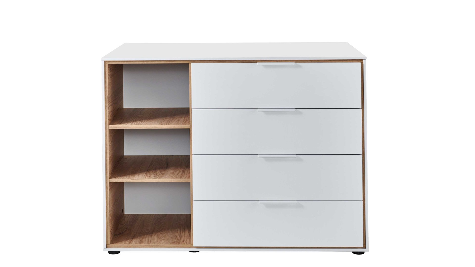 Die Kommode ist mit drei offenen eichefarbenen Fächern sowie vier geräumigen Schubkästen ausgestattet. Der obere Schubkasten verfügt zudem über einen Vollauszug, der ein bequemes Herausziehen ermöglicht. Bei Bedarf kann die Kombikommode auch mit einem Wickelaufsatz erweitert werden, der einfach aufgesetzt werden kann.