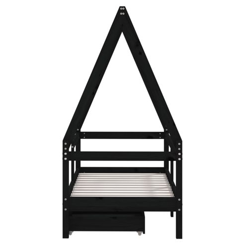 Mit diesem fantastischen Kinderbett aus Holz bietest du deinen Kleinen einen eigenen lustigen Platz! Massives Kiefernholz: Das Kinderbett ist aus massivem Kiefernholz gefertigt. Massives Kiefernholz ist ein wunderschönes Naturmaterial. Kiefernholz weist eine gerade Maserung auf und die Aststellen verleihen dem Material seine charakteristische, rustikale Optik.Robuste Latten: Das Kinderbett ist mit Holzlatten versehen, die für einen festen Halt, Belüftung und Stabilität sorgen.Design in Hausform: Dieses Kleinkinderbett weist ein durchdachtes Design mit einem Rahmen in Hausform auf, an dem du Bettvorhänge aufhängen kannst, um Privatsphäre für dein Kind zu schaffen.Mit Schubladen: Die mitgelieferten Schubladen bieten reichlich Platz für die Aufbewahrung von Kleinspielzeug, Kleidung und Bettzeug, um für Ordnung im Kinderzimmer zu sorgen.Durchdachtes Design: Dank der geringen Höhe des Einzelbettes können Kinder leicht ins Bett ein- und aussteigen. ** Farbe: Schwarz ** Material: Massives Kiefernholz ** Gesamtabmessungen: 145,5 x 75,5 x 147 cm (L x B x H) ** Passende Matratzengröße: 70 x 140 cm (B x L) (Matratze nicht im Lieferumfang inbegriffen) ** Abmessungen der Schublade ( pro Stück): 60 x 51 x 12,5 cm (B x T x H) ** Geeignet für Kinder zwischen 18 Monaten und 4 Jahren ** Zusammenbau erforderlich: Ja WARNUNG! Stelle dieses Kinderbett nicht in der Nähe von Wärmequellen, Fenstern und anderen Möbeln auf. WARNUNG! Benutze dieses Kinderbett nicht, wenn ein Teil kaputt ist, gerissen ist oder fehlt.