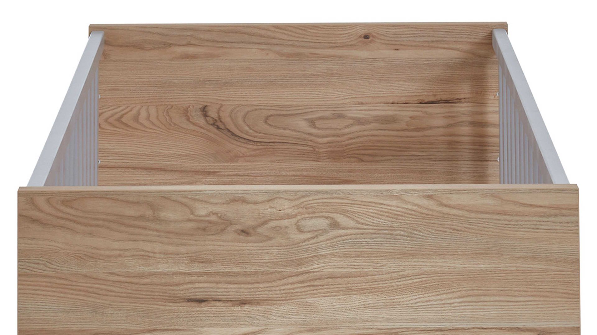 Das hochwertige PAIDI Babybettgestell Benne verbindet Montana-Eiche-Nachbildung mit kieselgrauen Melaminoberflächen. Letztere zeichnen sich vor allen Dingen durch ihre Lichtechtheit sowie die besonders ausgeprägte Kratz- und Stoßfestigkeit aus. Darüber hinaus sind sie sehr pflegeleicht. Der Holzton verströmt warmen, natürlichen Charme und harmoniert wunderbar mit dem Kieselgrau. Zusammen sorgen die Nuancen für eine moderne und elegante Optik.