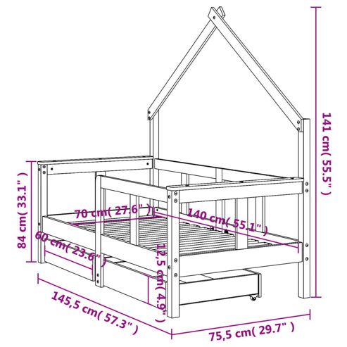 Mit diesem fantastischen Kinderbett aus Holz bietest du deinen Kleinen einen eigenen lustigen Platz! Massives Kiefernholz: Das Kinderbett ist aus massivem Kiefernholz gefertigt. Massives Kiefernholz ist ein wunderschönes Naturmaterial. Kiefernholz weist eine gerade Maserung auf und die Aststellen verleihen dem Material seine charakteristische, rustikale Optik.Robuste Latten: Das Kinderbett ist mit Holzlatten versehen, die für einen festen Halt, Belüftung und Stabilität sorgen.Design in Hausform: Mit seinem coolen und doch schlichten Design macht dieses Kleinkinderbett das Schlafengehen zu einem lustigen Erlebnis. Es bietet viele Möglichkeiten zum Spielen und Aufbauen einer kleinen Kinderwelt, um Kreativität und Fantasie anzuregen.Mit Schubladen: Die mitgelieferten Schubladen bieten reichlich Platz für die Aufbewahrung von Kleinspielzeug, Kleidung und Bettzeug, um für Ordnung im Kinderzimmer zu sorgen.Durchdachtes Design: Dank der geringen Höhe des Einzelbettes können Kinder leicht ins Bett ein- und aussteigen. ** Material: Massives Kiefernholz (unbehandelt) ** Gesamtabmessungen: 145,5 x 75,5 x 141 cm (L x B x H) ** Passende Matratzengröße: 70 x 140 cm (B x L) (Matratze nicht im Lieferumfang inbegriffen) ** Abmessungen der Schublade (pro Stück): 60 x 49 x 12,5 cm (B x T x H) ** Geeignet für Kinder zwischen 18 Monaten und 4 Jahren ** Zusammenbau erforderlich: Ja WARNUNG! Stelle dieses Kinderbett nicht in der Nähe von Wärmequellen, Fenstern und anderen Möbeln auf. WARNUNG! Benutze dieses Kinderbett nicht, wenn ein Teil kaputt ist, gerissen ist oder fehlt.